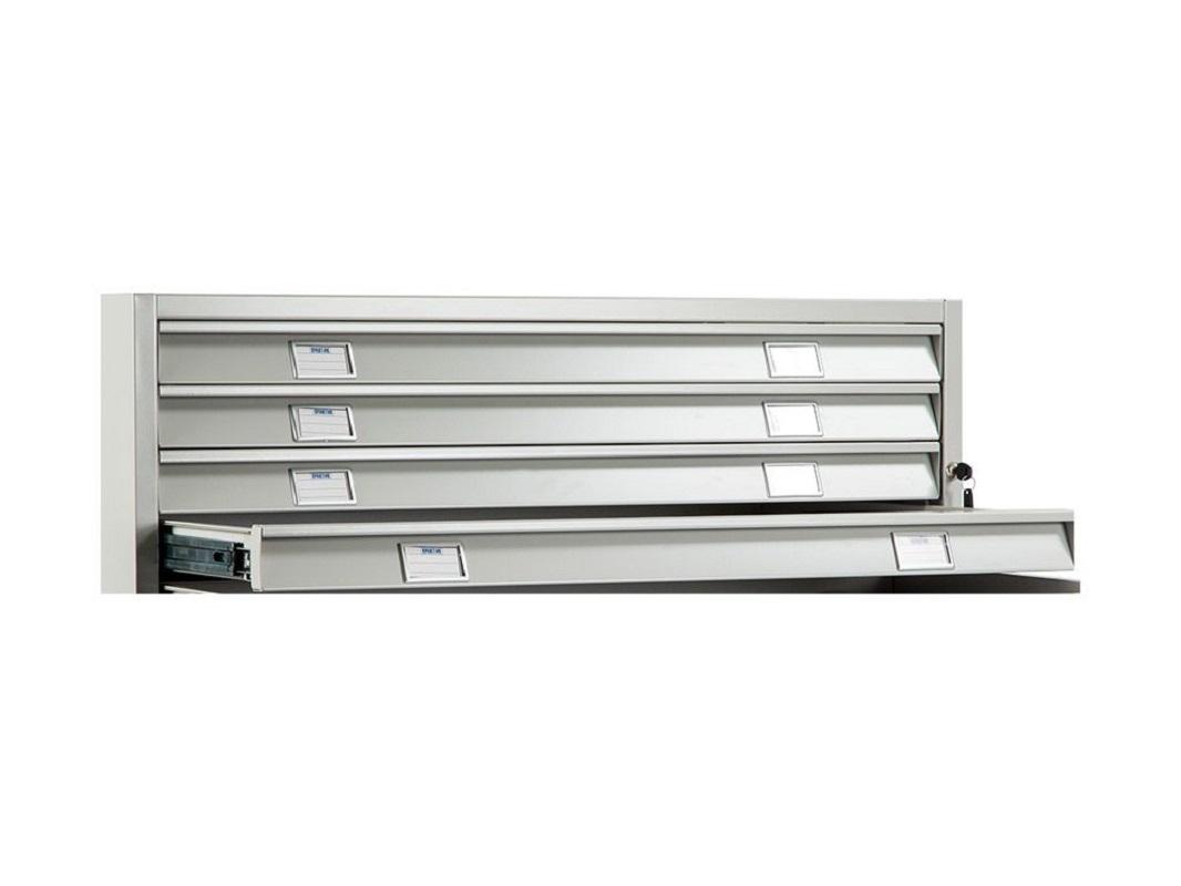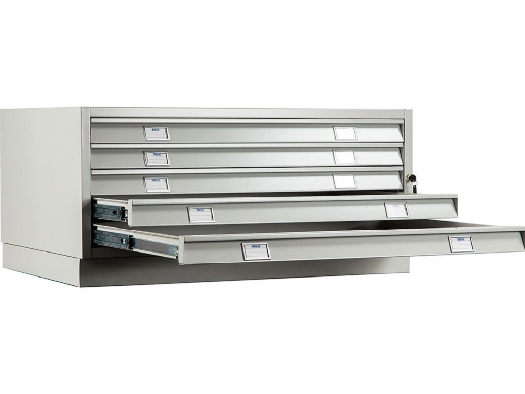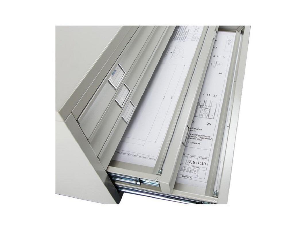 Такие картотеки используют для хранения документов формата А1. Опционально можно установить специальные разделители для хранения файлов в А2, А3, А4. Широкий шкаф отлично подходит для складирования геологоразведочных карт, планов и конструкторских чертежей и т.д. Укомплектован пятью выдвижными ящиками с системой полного выдвижения. Каждый ящик установлен на телескопические направляющие, которые обеспечивают свободный и плавный ход даже при полной загрузке. Максимально допустимая нагрузка 20 килограмм.
