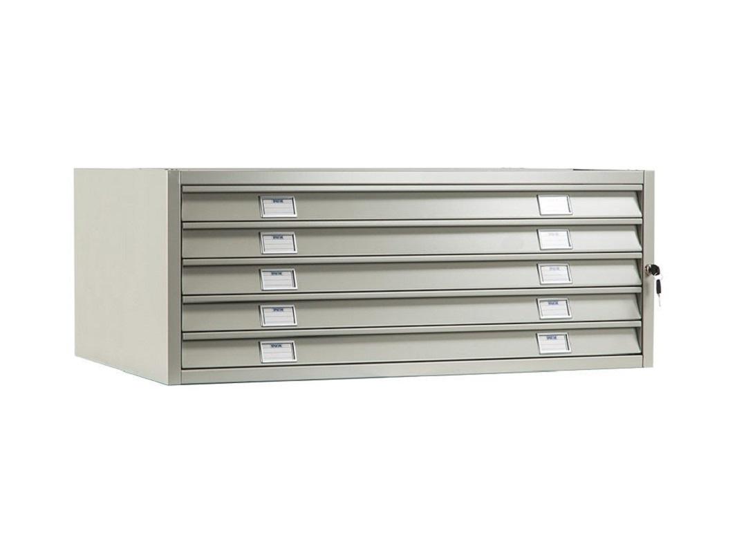 Такие картотеки используют для хранения документов формата А1. Опционально можно установить специальные разделители для хранения файлов в А2, А3, А4. Широкий шкаф отлично подходит для складирования геологоразведочных карт, планов и конструкторских чертежей и т.д. Укомплектован пятью выдвижными ящиками с системой полного выдвижения. Каждый ящик установлен на телескопические направляющие, которые обеспечивают свободный и плавный ход даже при полной загрузке. Максимально допустимая нагрузка 20 килограмм.