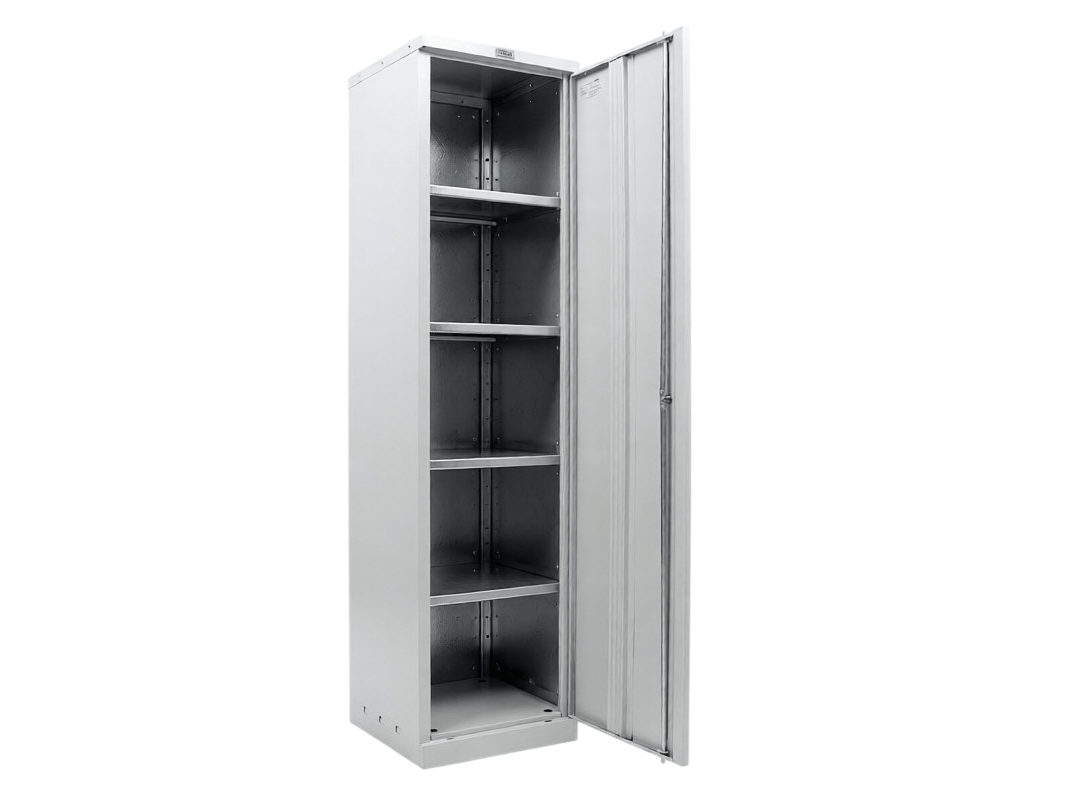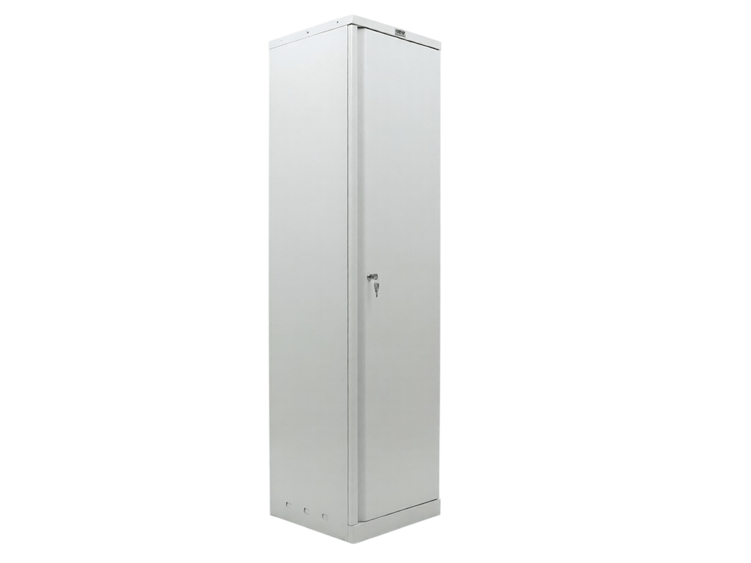 Стандартным цветом шкафа является серый полуматовый, но по вашему желанию его можно окрасить в любой другой цвет по шкале RAL. Это аккуратный и вместительный шкаф, высота которого составляет 1830 мм. Его вес пустого — не более 30 килограмм, и он поставляется в разобранном виде.