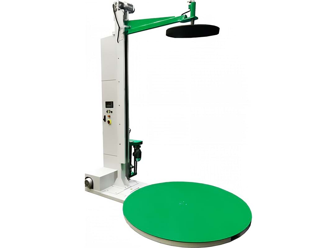 Прижим опускается на груз перед началом обмотки. Пневматический механизм создаёт равномерное давление. Во время вращения паллеты груз остаётся зафиксированным, что обеспечивает качественную обмотку. После завершения цикла прижим автоматически поднимается.