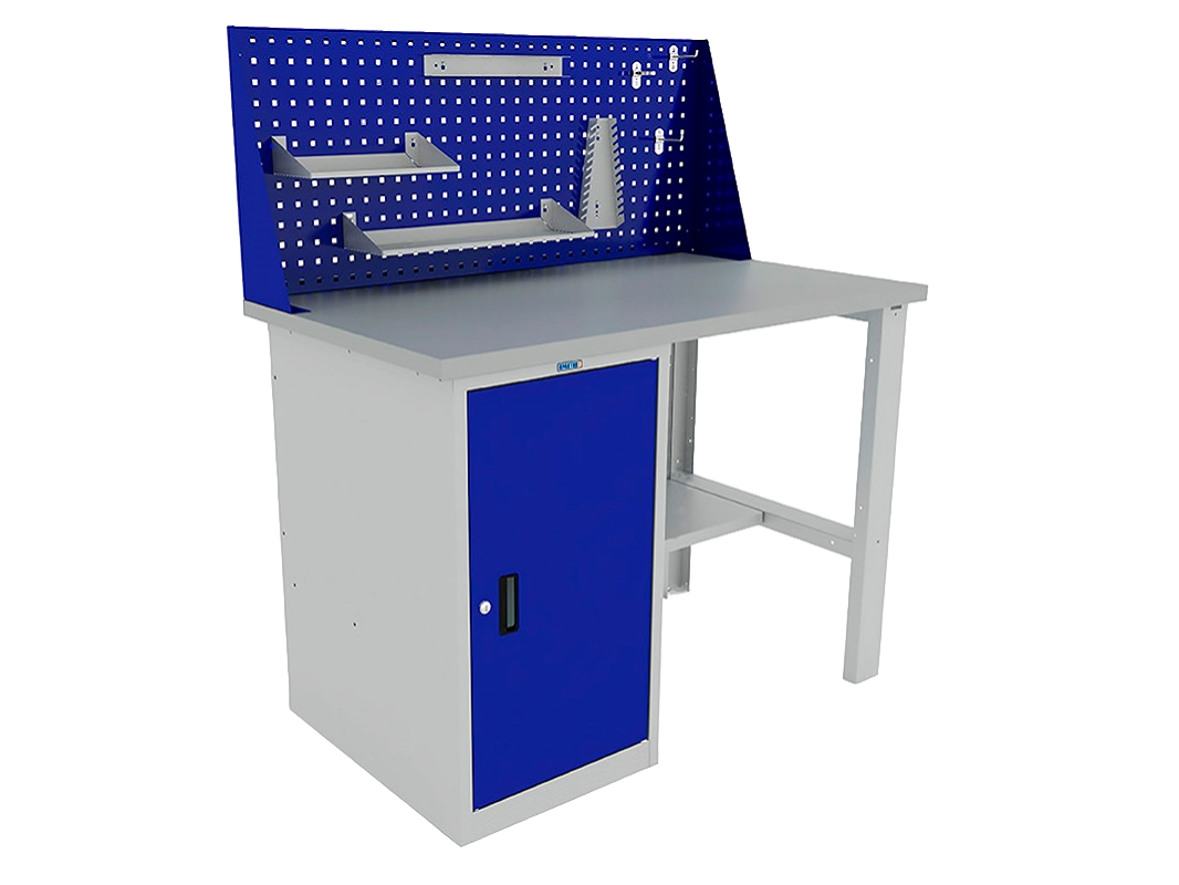 Зачастую это перфорированный экран (плоскость, на которую крепят крючки и держатели для инструментов), упоры, тиски и т. д. При желании клиента можно полностью собрать необходимую подборку из тумб (имеются как с дверцами, так и с выдвижными полками), столешниц (параметры разнообразные, подбирают под требования специалиста, типовые: высота — 80–90 см, ширина — 80–100 см, длина также подбирается индивидуально).