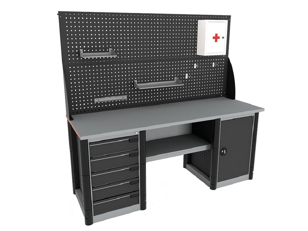 Данная модель оснащена первым вариантом в 2000 мм с максимальной нагрузкой до 1500 килограмм. Верстак укомплектован двумя тумбами, внутри одного 5 выдвижных ящика с максимальной нагрузкой до 90 килограмм, внутри другого две съёмные полки с максимальной нагрузкой до 120 килограмм. Установлена дополнительная защита верстака от случайных повреждений во время работы, боковые прорезиненные бампера на тумбе. Удобная перфорация стенки тумбы и опоры позволят разместить большое количество самых разных приспособлений (которые продаются отдельно). Универсальные модели позволяют модулировать разные возможные варианты верстаков под все самые разные желания и потребности.