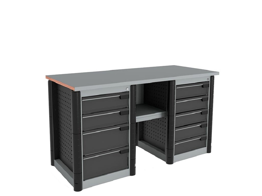 Данная модель оснащена первым вариантом в 1600 мм с максимальной нагрузкой до 1500 килограмм. Верстак укомплектован двумя тумбами, 9 выдвижных ящика с максимальной нагрузкой до 90 килограмм. Установлена дополнительная защита верстака от случайных повреждений во время работы, боковые прорезиненные бампера на тумбе. Удобная перфорация стенки тумбы и опоры позволят разместить большое количество самых разных приспособлений (которые продаются отдельно). Универсальные модели позволяют модулировать разные возможные варианты верстаков под все самые разные желания и потребности.