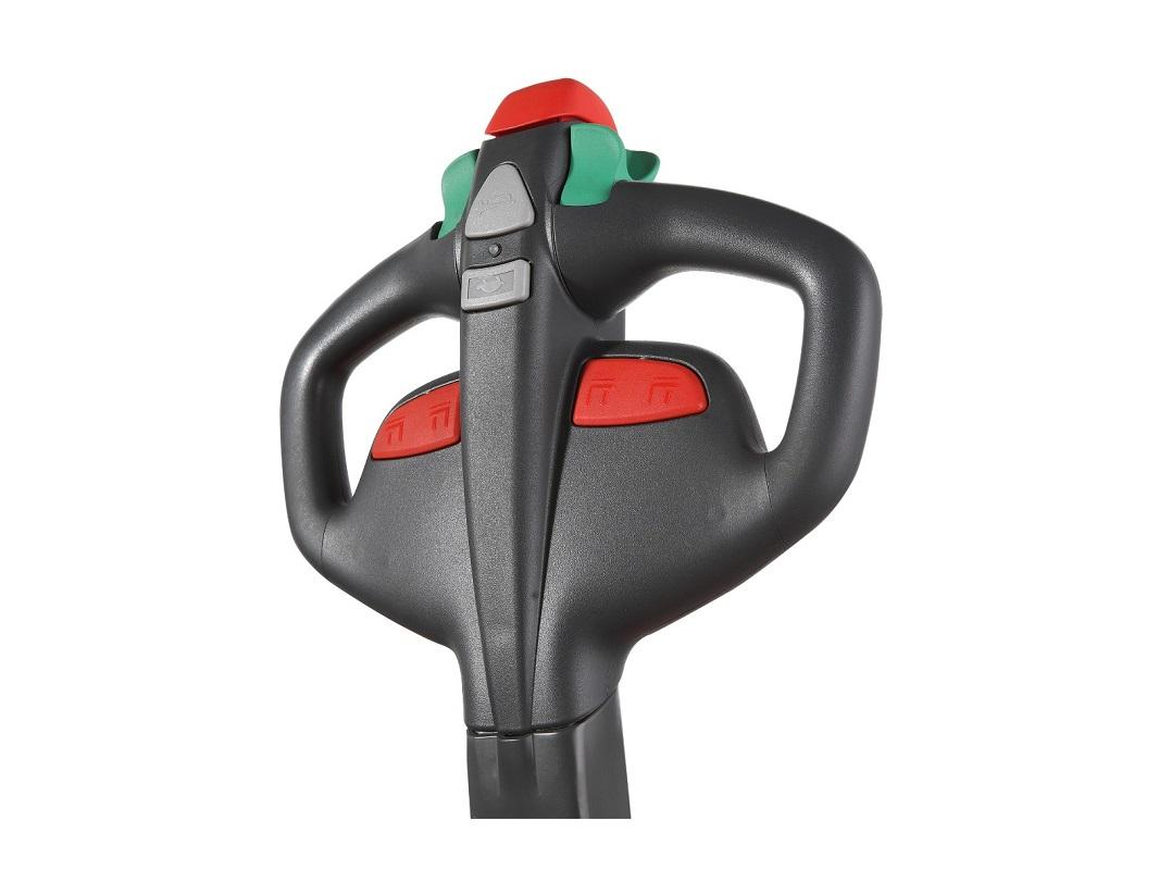 Управление тележкой осуществляется стоя или пешком, благодаря системе EPS (электрическое рулевое управление). Она позволяет работать без перерыва до 8 часов, а ёмкость аккумулятора варьируется от 180 до 315 В/Ач. Удобная ручка управления REMA с технологией CAN-BUS обеспечивает комфортную работу оператора.