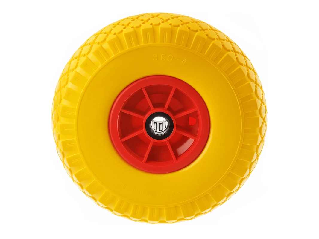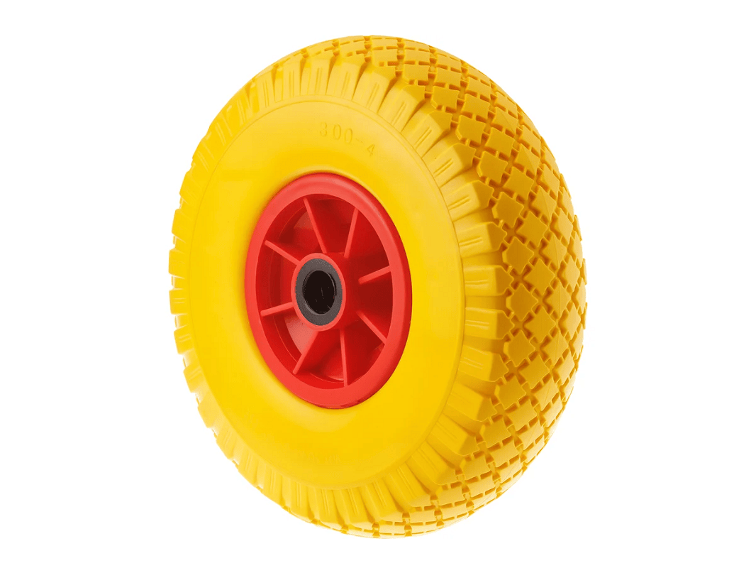 Колесо пенополиуретановое 3.00-4 с симметричной ступицей, пластиковым ободом и роликовым подшипником, ось 20 мм PU 1807-20 (260 мм/120 кг) отличительной чертой являются прочность и долговечность: шина с трудом прокалывается, а в случае прокола колесо не выходит из строя сразу, а пружинит.
