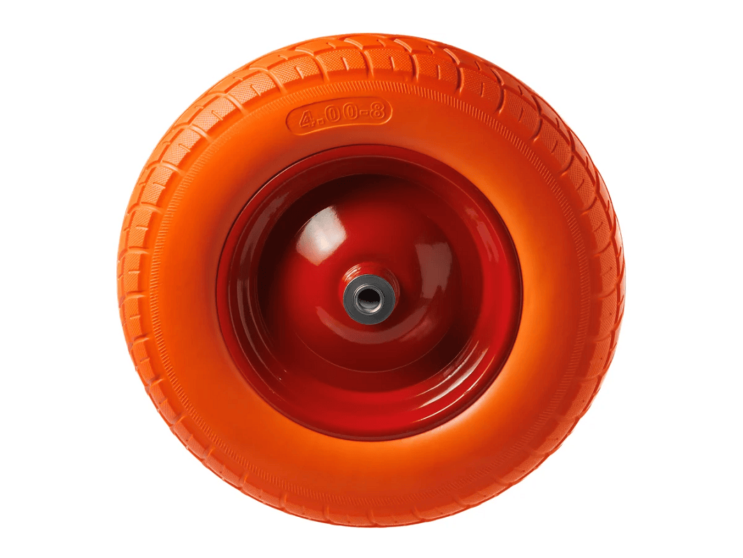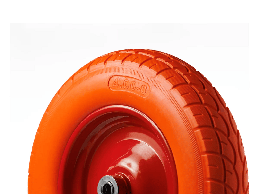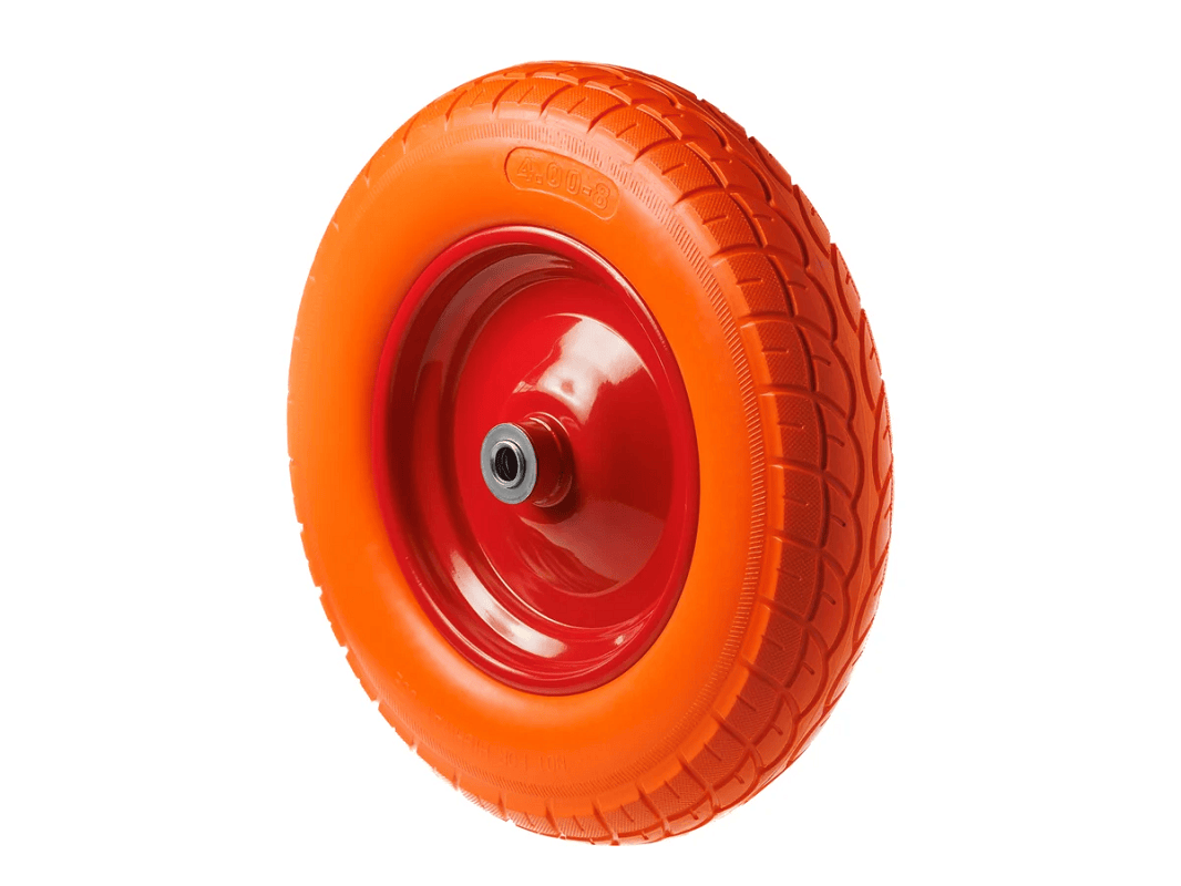 Колесо пенополиуретановое 4.00-8 с симметричной ступицей, металлическим ободом и шариковым подшипником, ось 16 мм PU 3000-16 (380 мм/160 кг) отличаются высокой прочностью и долговечностью. Их шина устойчива к проколам, но даже если это произошло, колесо не выйдет из строя сразу, а будет пружинить.