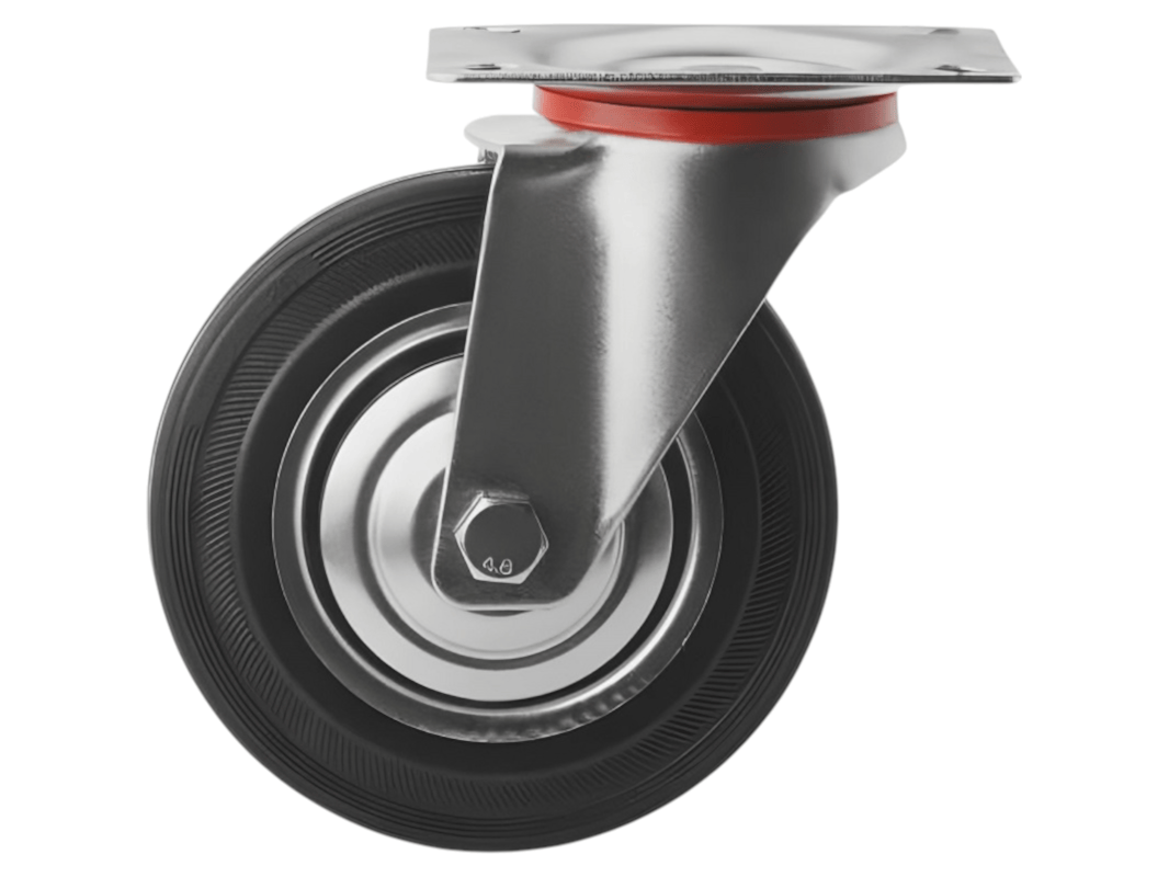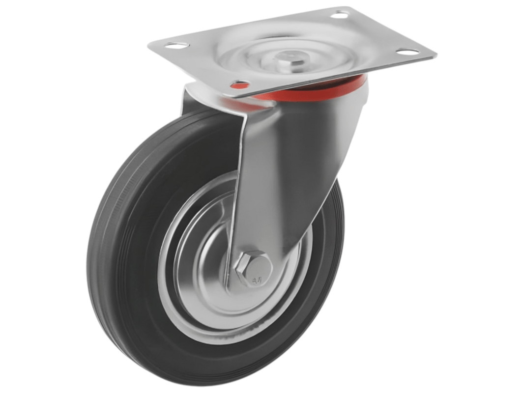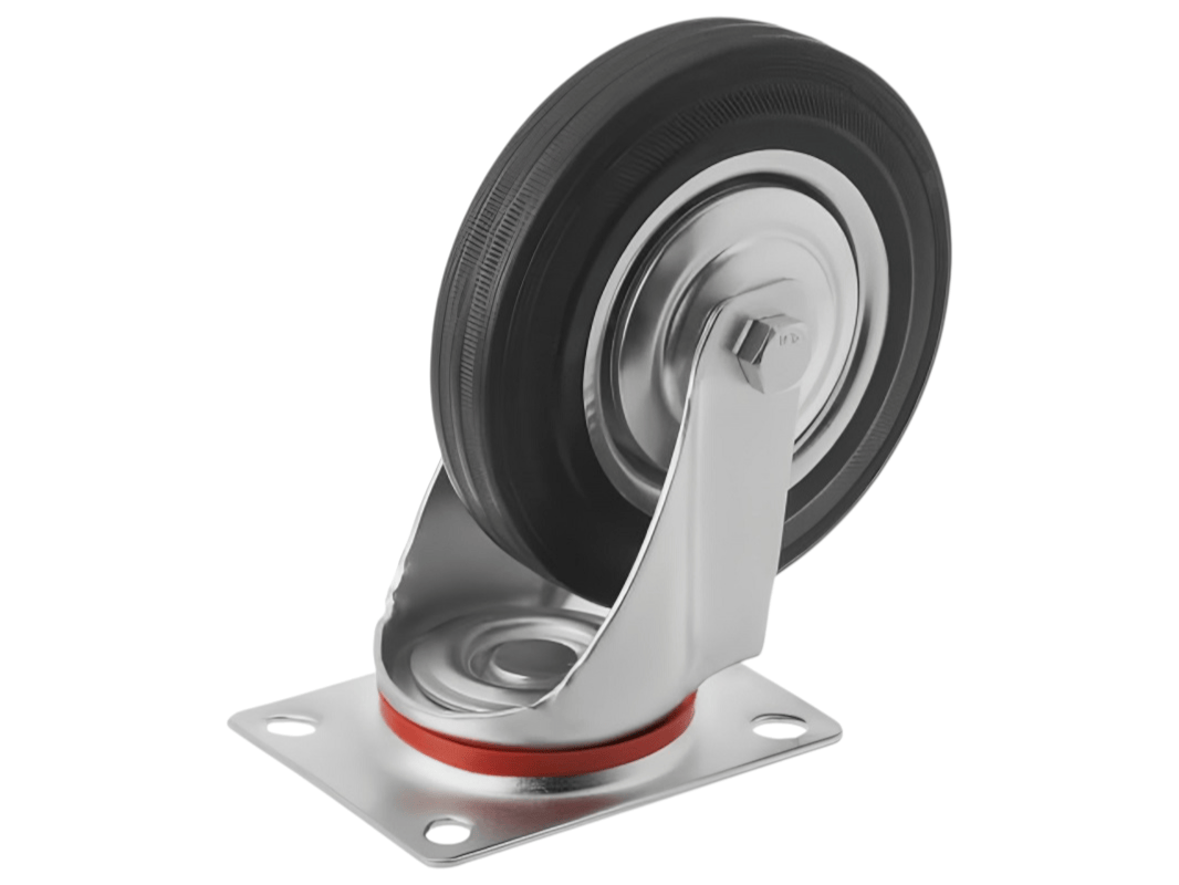 Промышленные колеса с поворотной площадкой из черной резины SC 63 устанавливаются на платформенные тележки, мусорные контейнеры, промышленное оборудование, строительные вышки и другие виды техники. Благодаря поворотному механизму делают её более манёвренной и лёгкой в управлении.