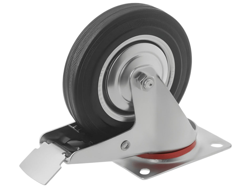 Промышленные колеса с поворотной площадкой и тормозом из черной резины SCB 63 предназначены для установки на платформенные тележки, мусорные контейнеры, промышленное оборудование и строительные вышки. Поворотный механизм обеспечивает маневренность и легкость в управлении, а тормоз позволяет зафиксировать тележку на месте.