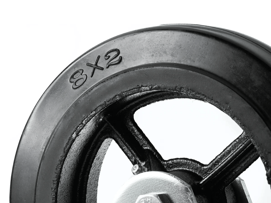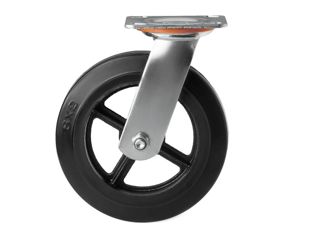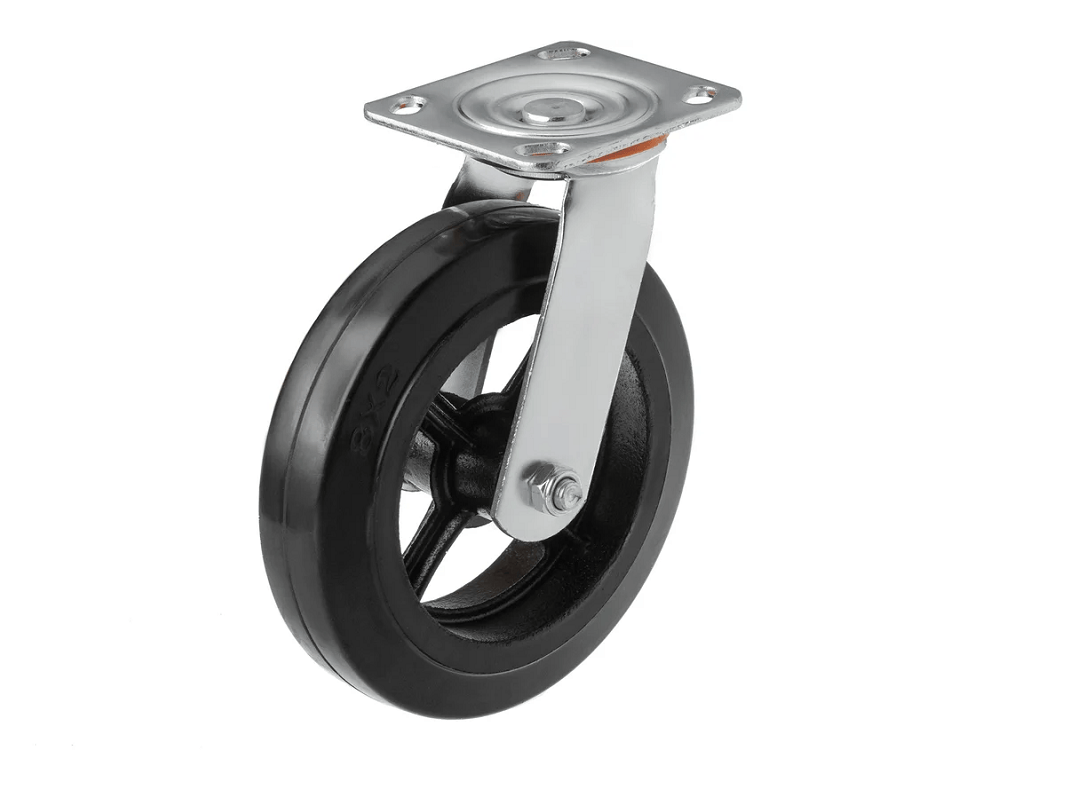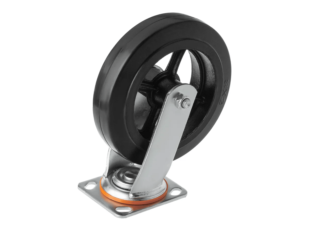 Колесо чугунное большегрузное с неповоротной площадкой и литым резиновым слоем SCD 80 (200 мм/280 кг) – платформа под 4 болта. Поворотный механизм добавляет маневренности и делает эксплуатацию легче и удобнее.