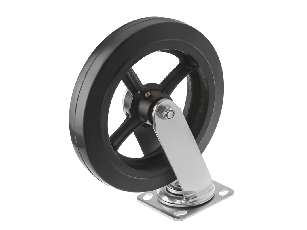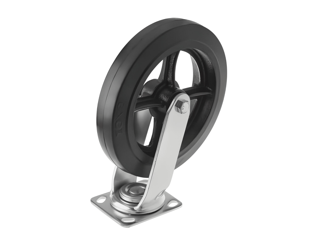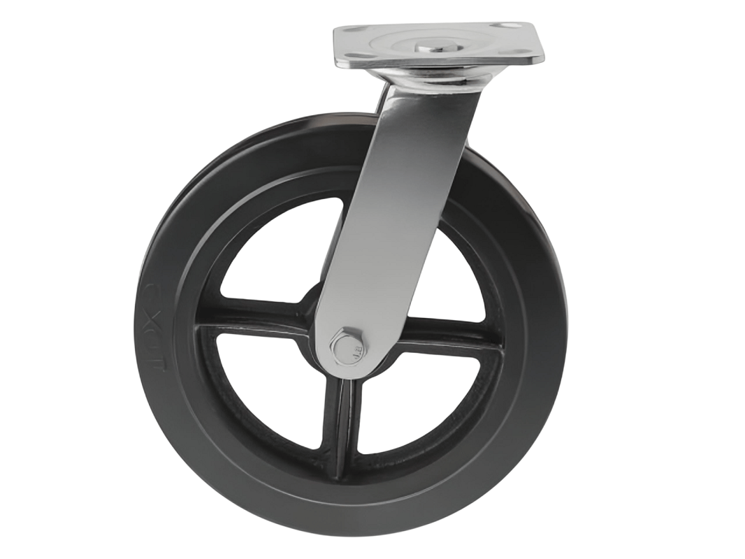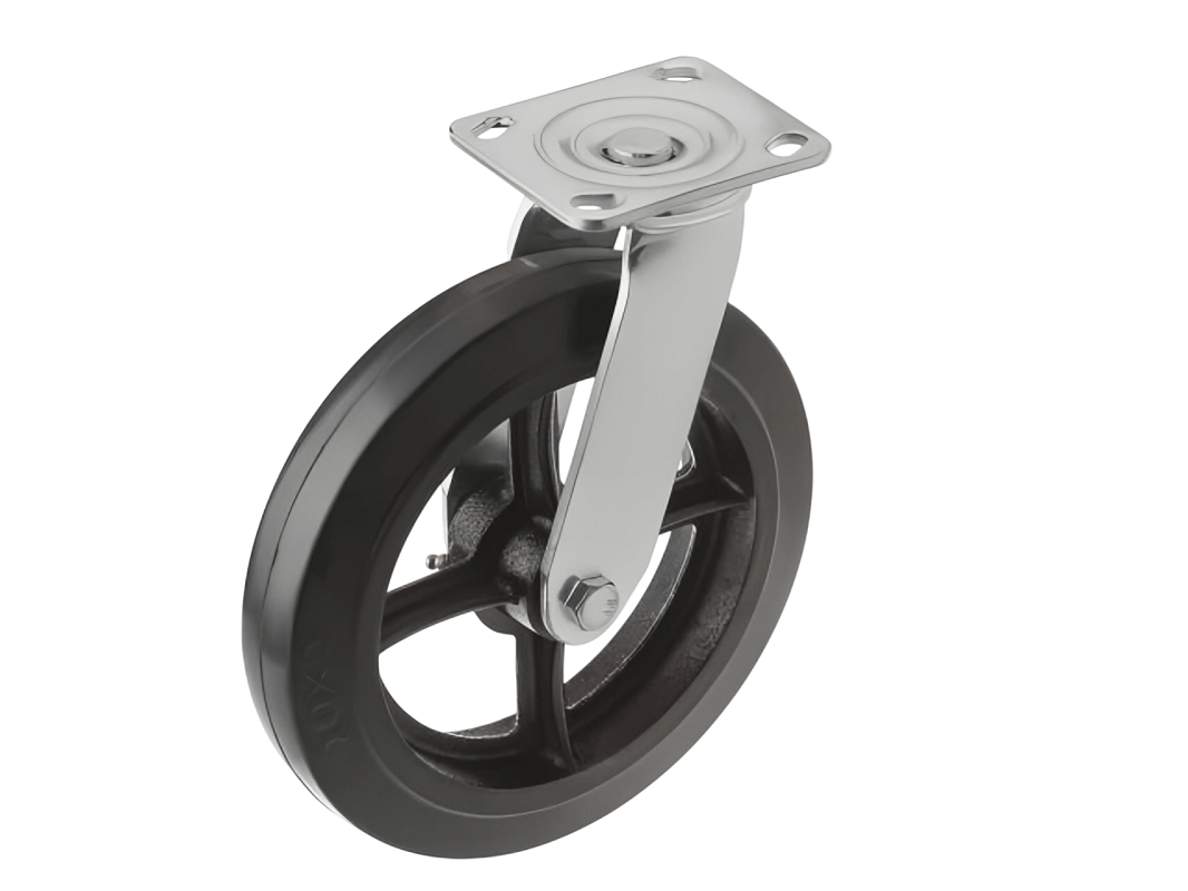 Колесо чугунное большегрузное с неповоротной площадкой и литым резиновым слоем SCD 85 (250 мм/350 кг) – платформа под 4 болта. Поворотный механизм добавляет маневренности и делает эксплуатацию легче и удобнее.