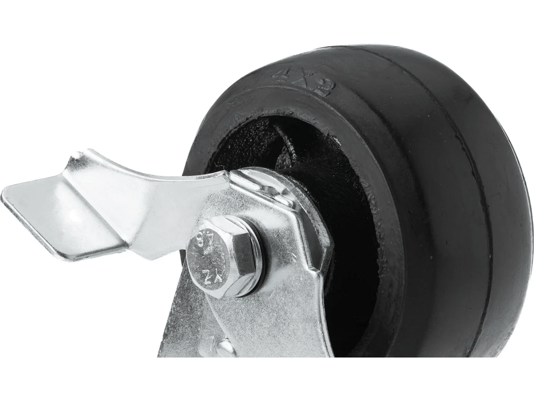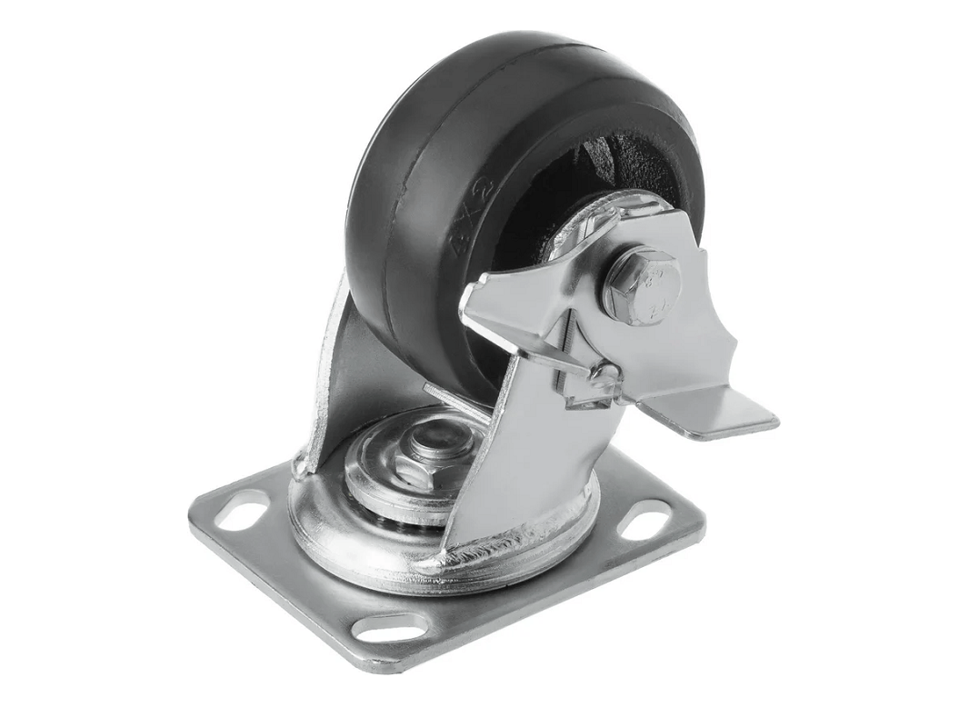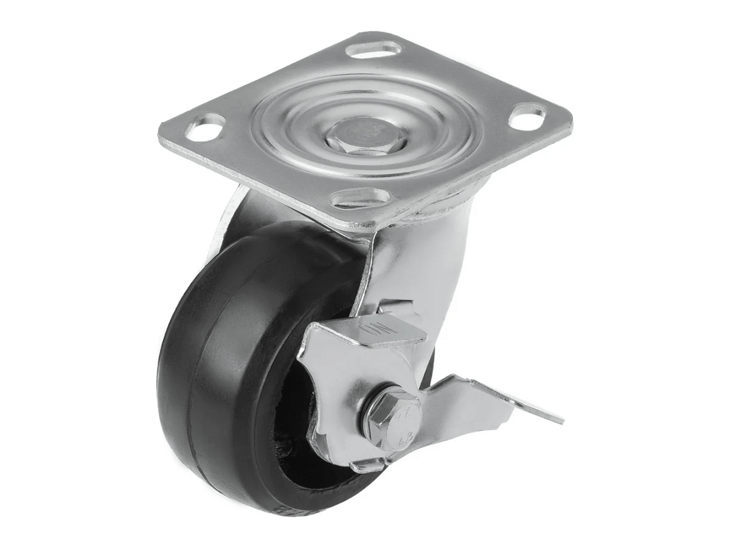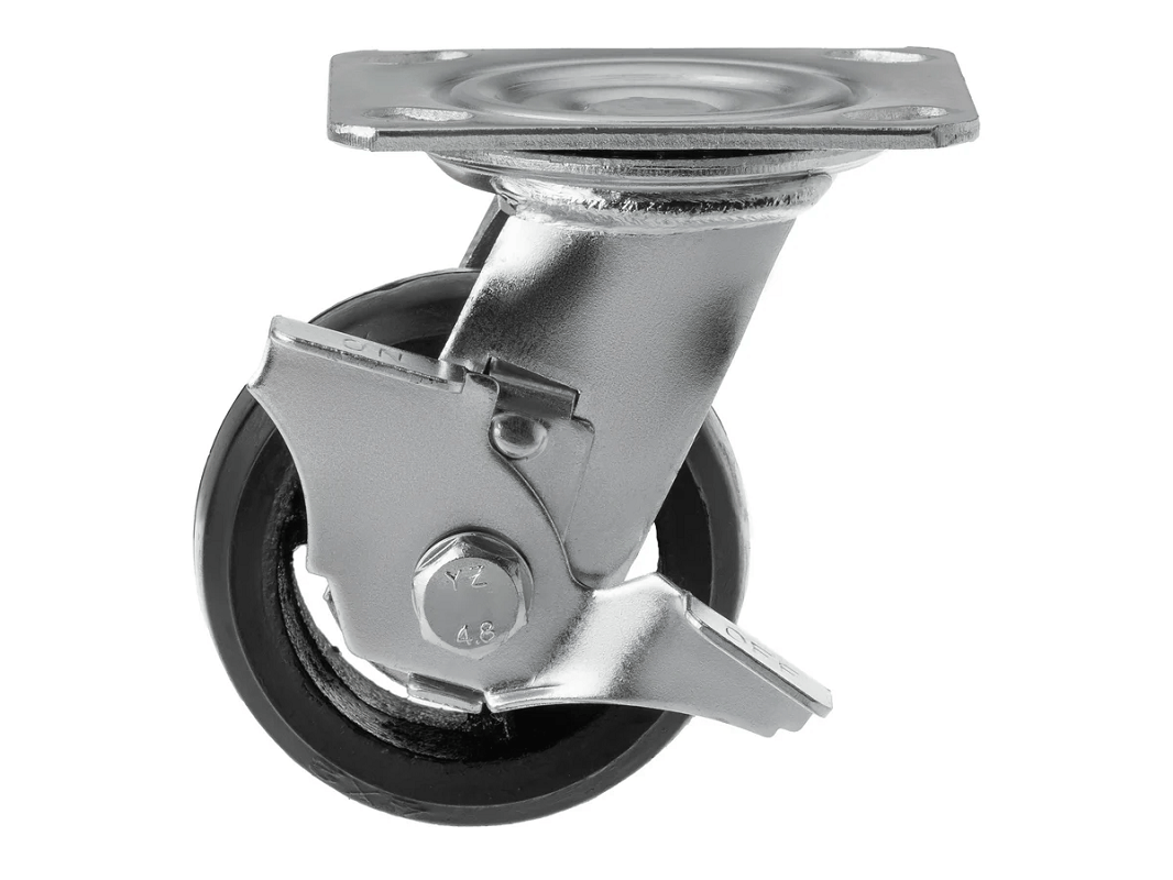 Колесо чугунное большегрузное с поворотной площадкой и тормозом и литым резиновым слоем SCDB 42 (100 мм/130 кг), тип крепления – платформа под 4 болта. Поворотный механизм добавляет маневренности и делает эксплуатацию легче и удобнее. А тормоз позволяет зафиксировать на месте складскую технику и безопасно совершить разгрузо-погрузочные работы.