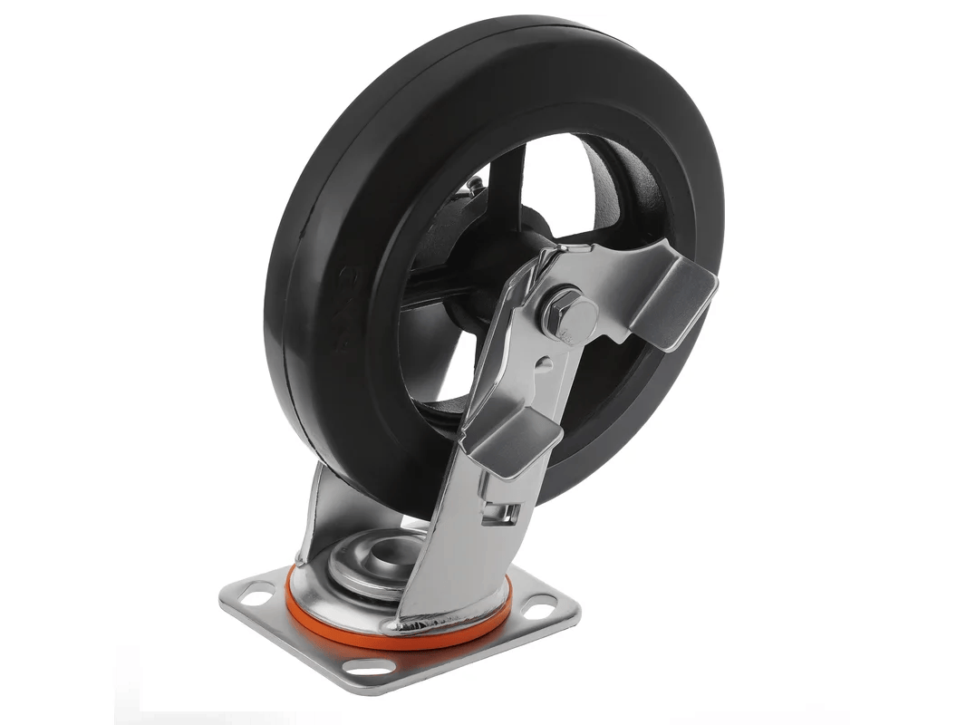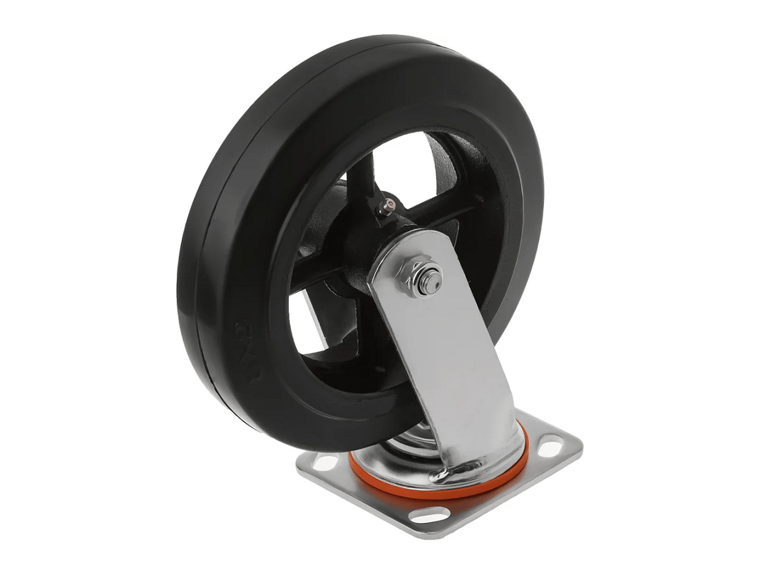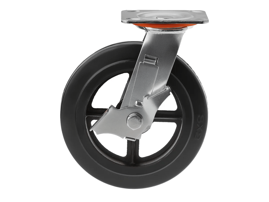 Колесо чугунное большегрузное с поворотной площадкой и тормозом и литым резиновым слоем SCDB 80 (200 мм/280 кг), тип крепления – платформа под 4 болта. Поворотный механизм добавляет маневренности и делает эксплуатацию легче и удобнее. А тормоз позволяет зафиксировать на месте складскую технику и безопасно совершить разгрузо-погрузочные работы.