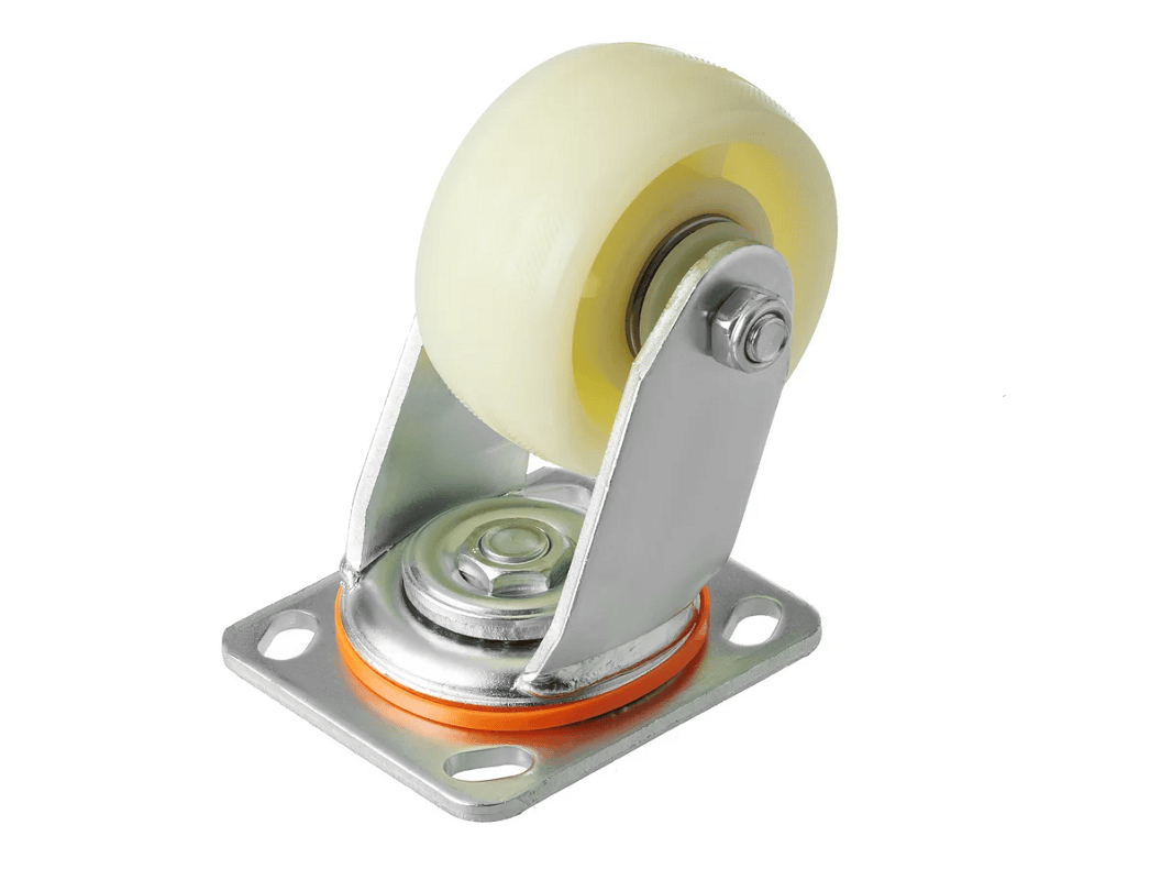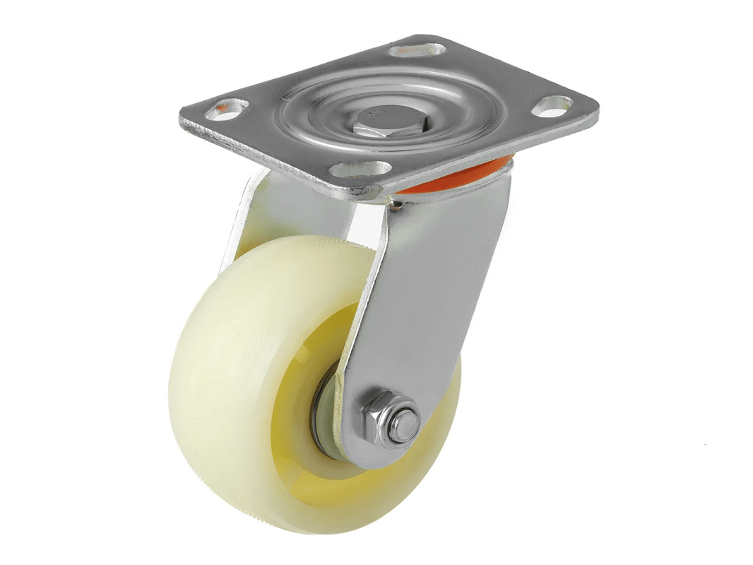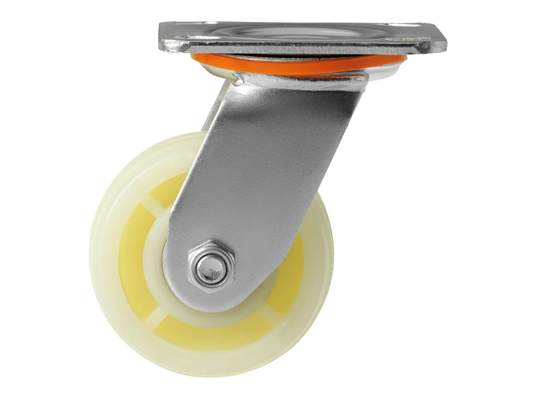 - Эти колёса изготовлены из прочного нейлона, что обеспечивает их долговечность и устойчивость к износу. Нейлон также обладает отличными амортизационными свойствами, что снижает вибрацию и шум при движении;