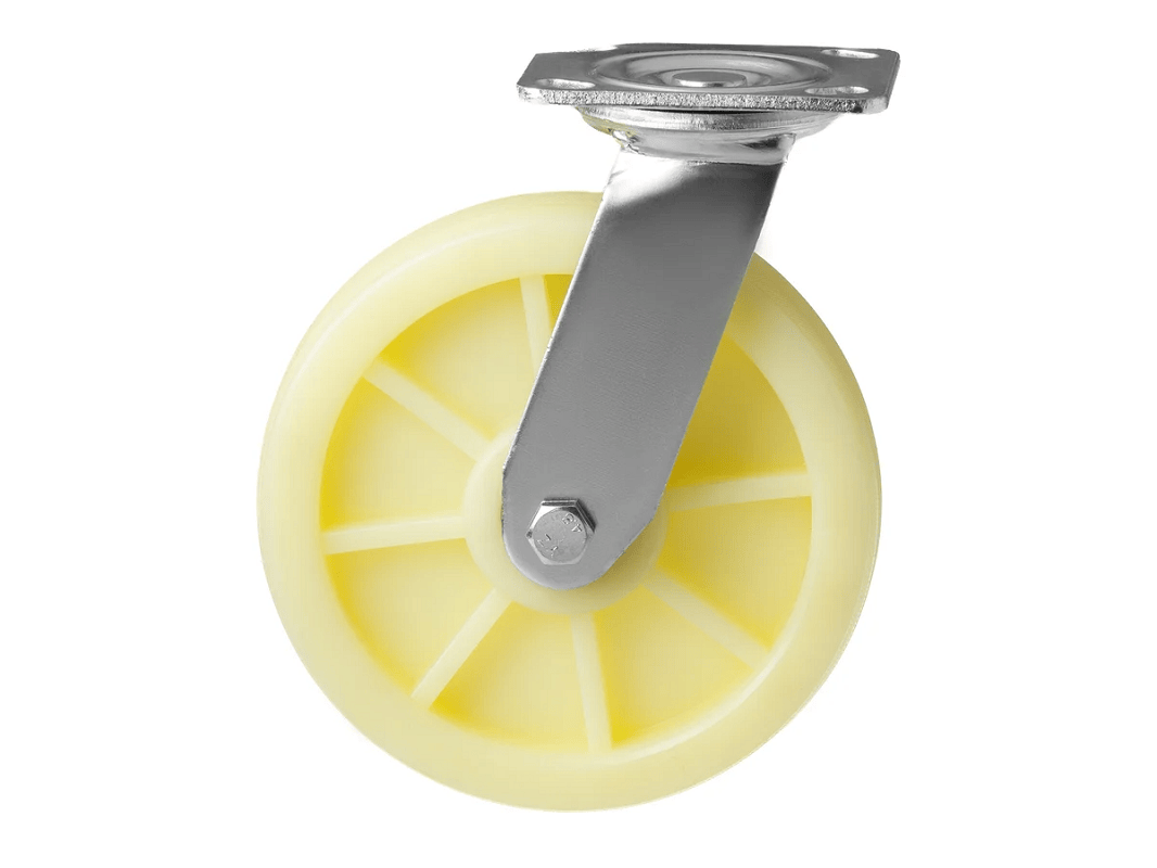 Нейлоновые колеса зачастую используются в торговых центрах и в медицинских учреждениях благодаря своим уникальным свойствам. Отсутствует износ при использовании на ровной поверхности, защита от коррозии благодаря оцинковке кронштейна. Использование в агрессивной химической среде (моющие средства, масла и т. п.).