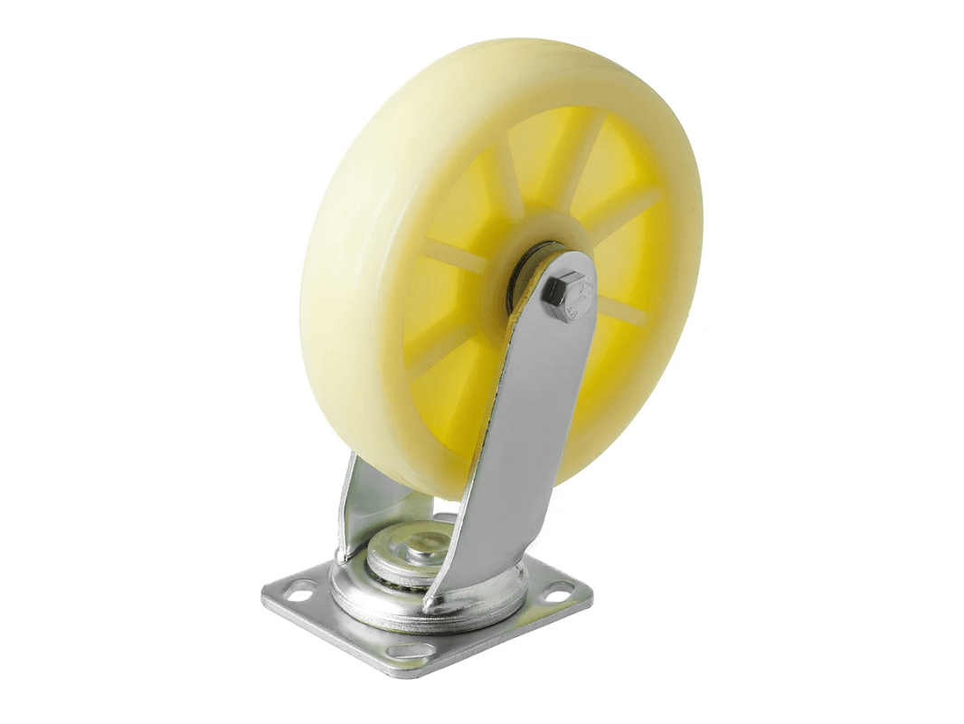- Эти колёса изготовлены из прочного нейлона, что обеспечивает их долговечность и устойчивость к износу. Нейлон также обладает отличными амортизационными свойствами, что снижает вибрацию и шум при движении;