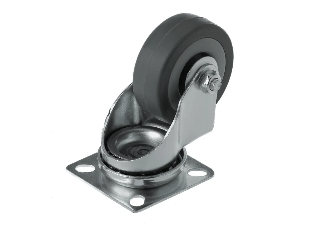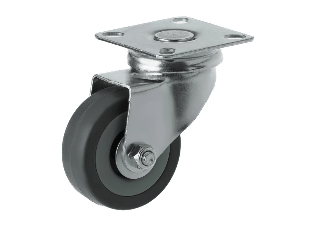 Колесо аппаратное с поворотной площадкой и втулкой скольжения SCg 25 (50 мм/50 кг). Ступица оборудована подшипником скольжения и втулкой, что обеспечивает плавный и тихий ход. Стальной кронштейн, устойчивый к коррозии, надёжно фиксирует конструкцию. Поворотный узел оснащён двухрядным шарикоподшипником, что гарантирует надёжность и долговечность.