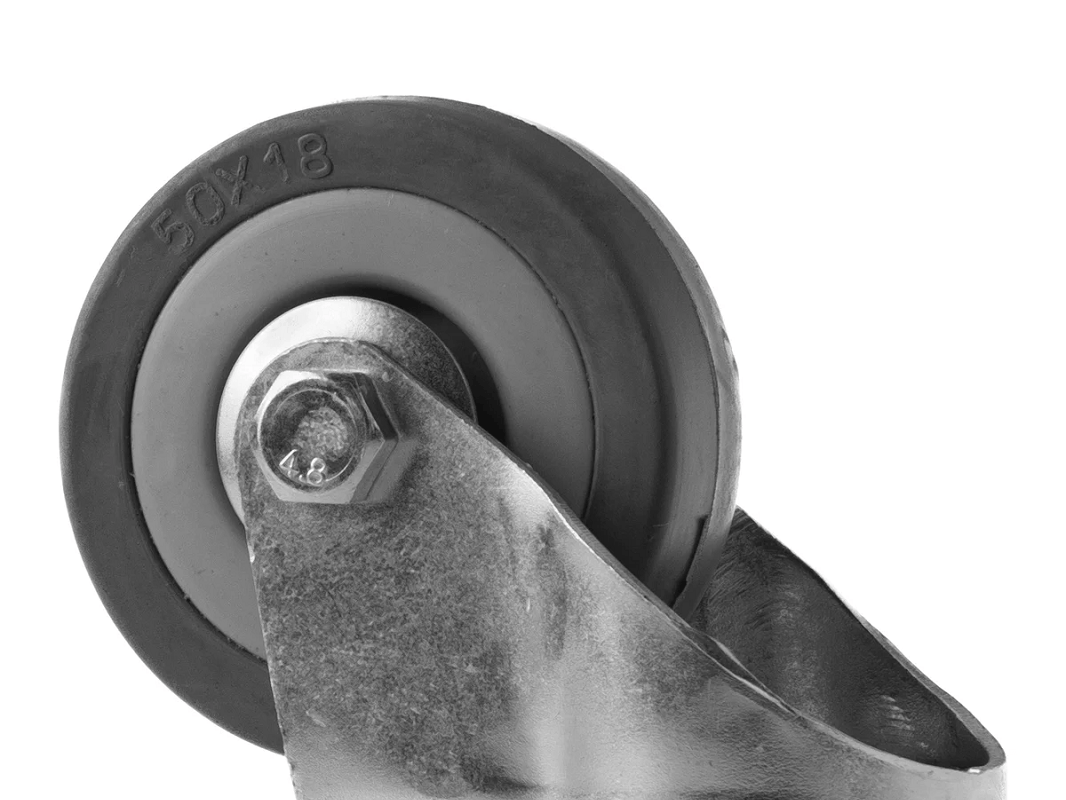 Шинка из термопластичной серо-голубой резины обеспечивает тихий ход, поглощает вибрацию и не оставляет следов на полу. Обладают хорошими ходовыми качествами и манёвренностью. Подходят для использования в условиях строгого соблюдения санитарно-гигиенических норм, так как легко очищаются от загрязнений. Температурный режим применения: от -10С до +50С.
