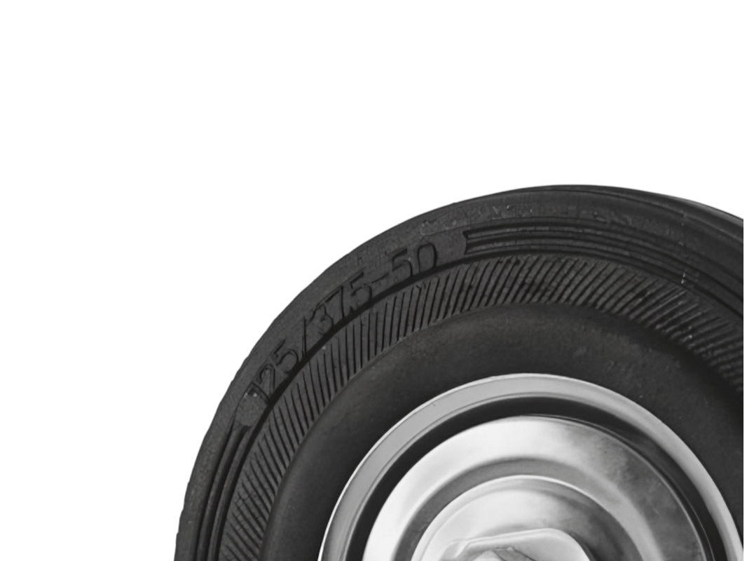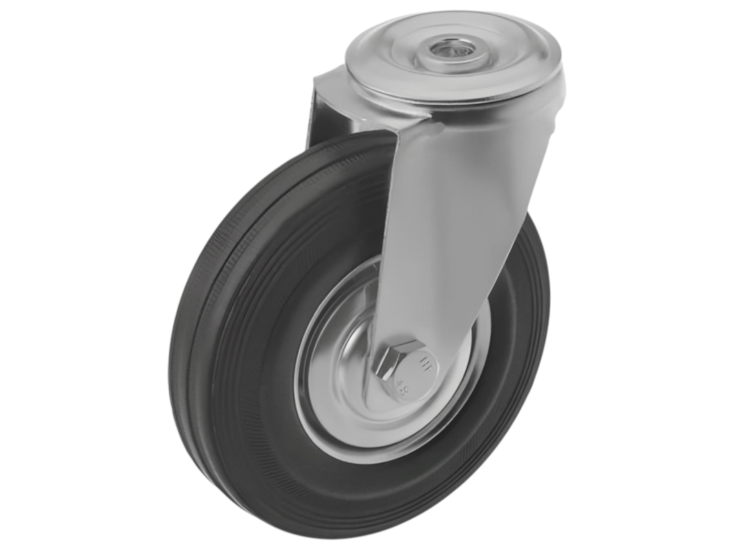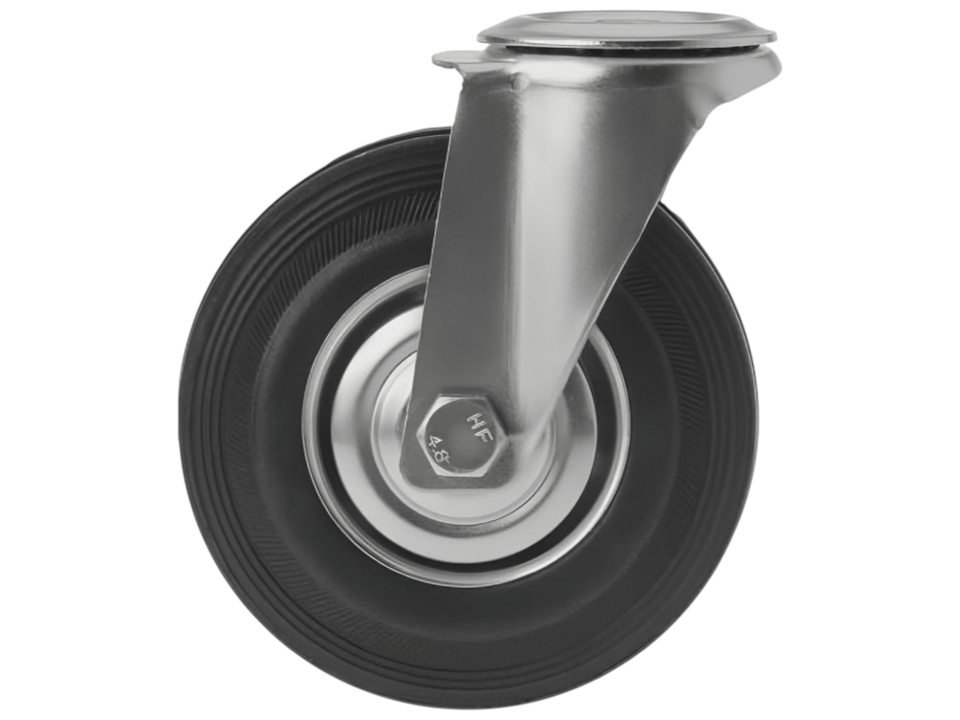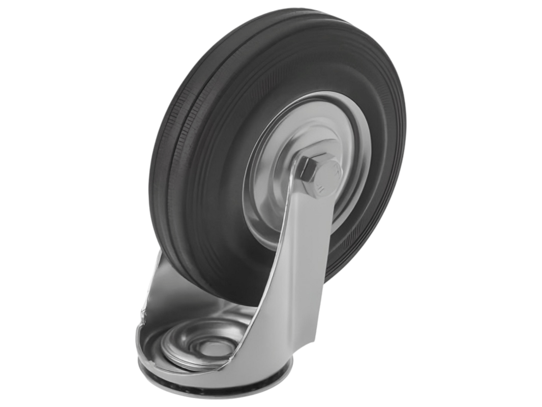 Конструкция колёс включает роликовый подшипник, стальной обод и шинку из чёрной резины, которая обеспечивает плавность и мягкость хода. Однако, по сравнению с полиуретановыми колёсами, эти колёса менее износостойки. Поворотный узел с двухрядным шарикоподшипником надёжно защищён пластиковым пыльником, что обеспечивает длительный срок службы.