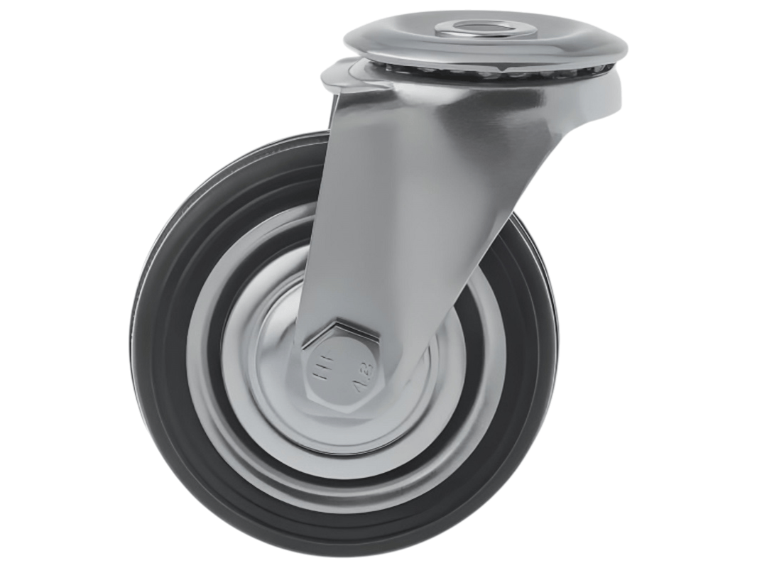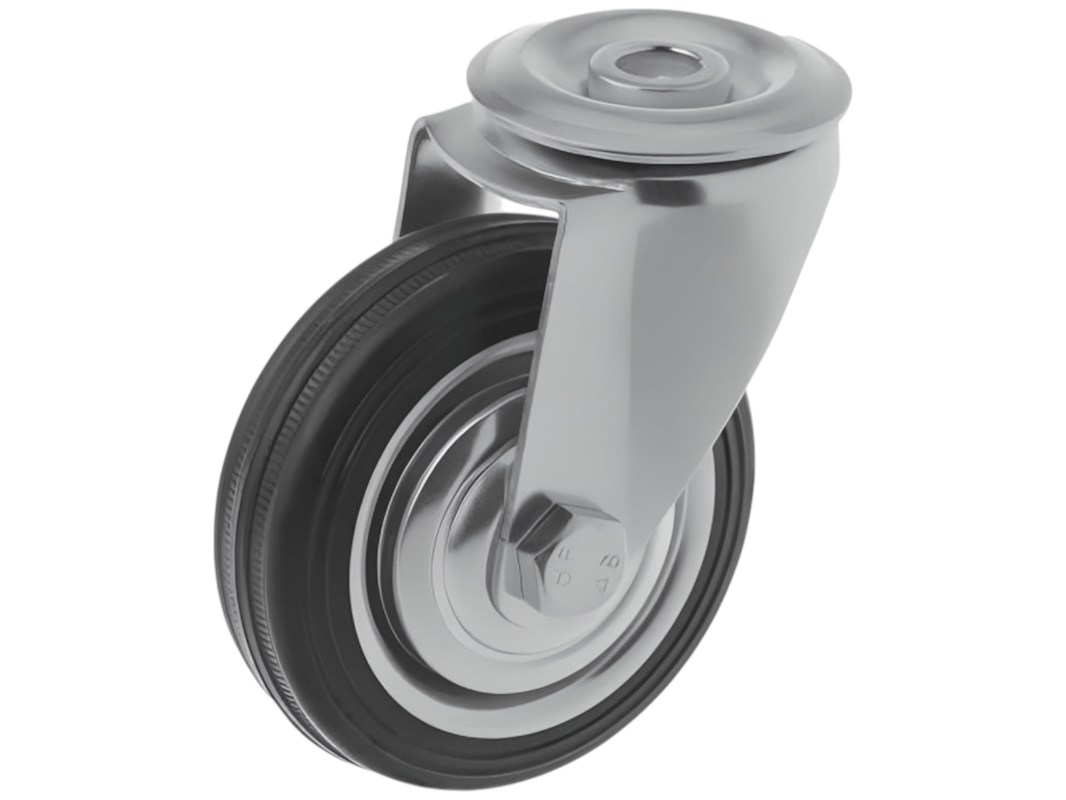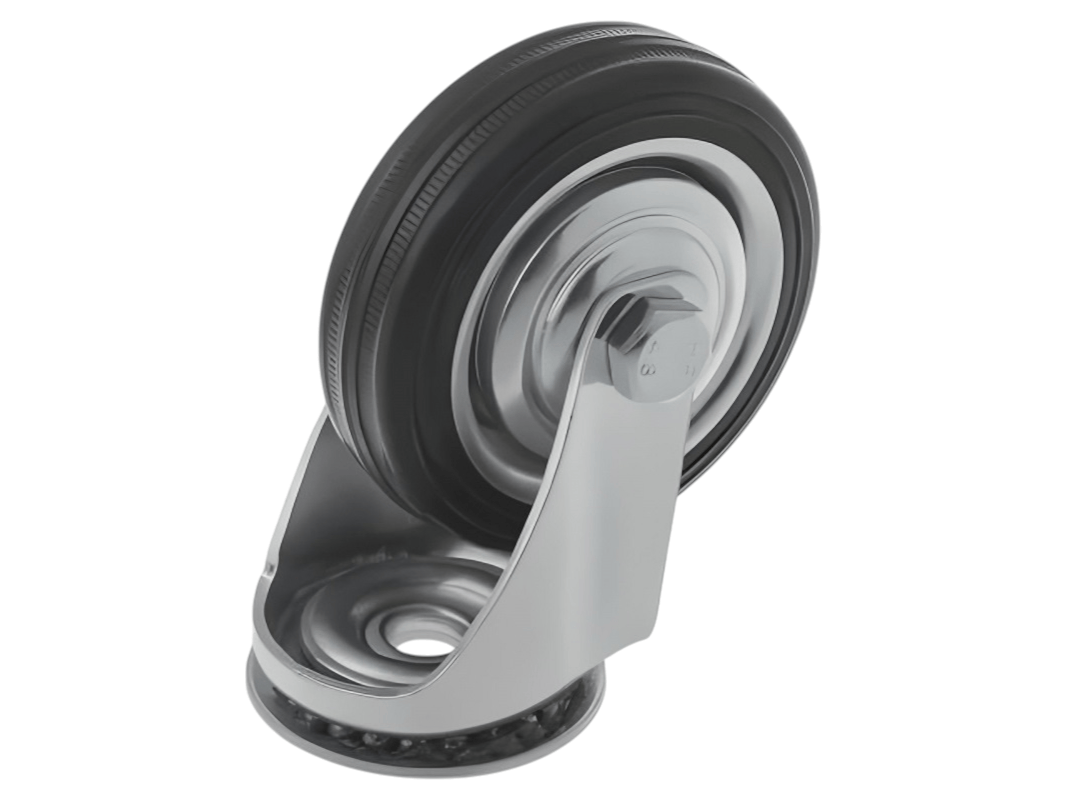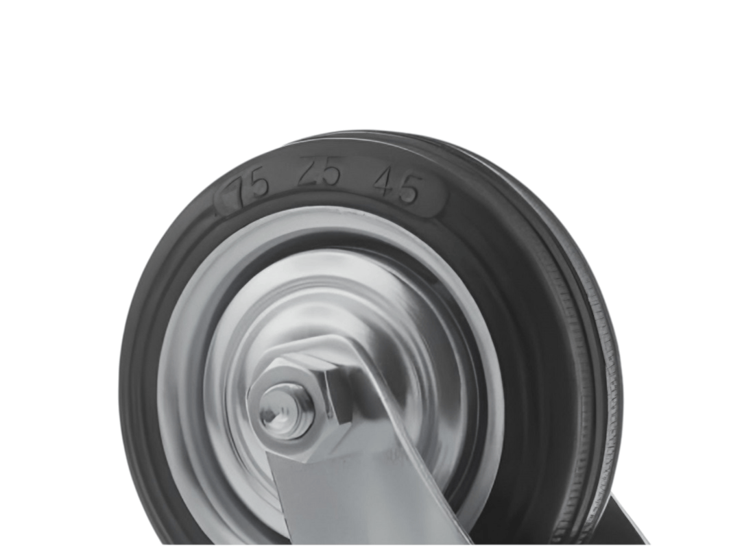 Конструкция колёс включает роликовый подшипник, стальной обод и шинку из чёрной резины, которая обеспечивает плавность и мягкость хода. Однако, по сравнению с полиуретановыми колёсами, эти колёса менее износостойки. Поворотный узел с двухрядным шарикоподшипником надёжно защищён пластиковым пыльником, что обеспечивает длительный срок службы.
