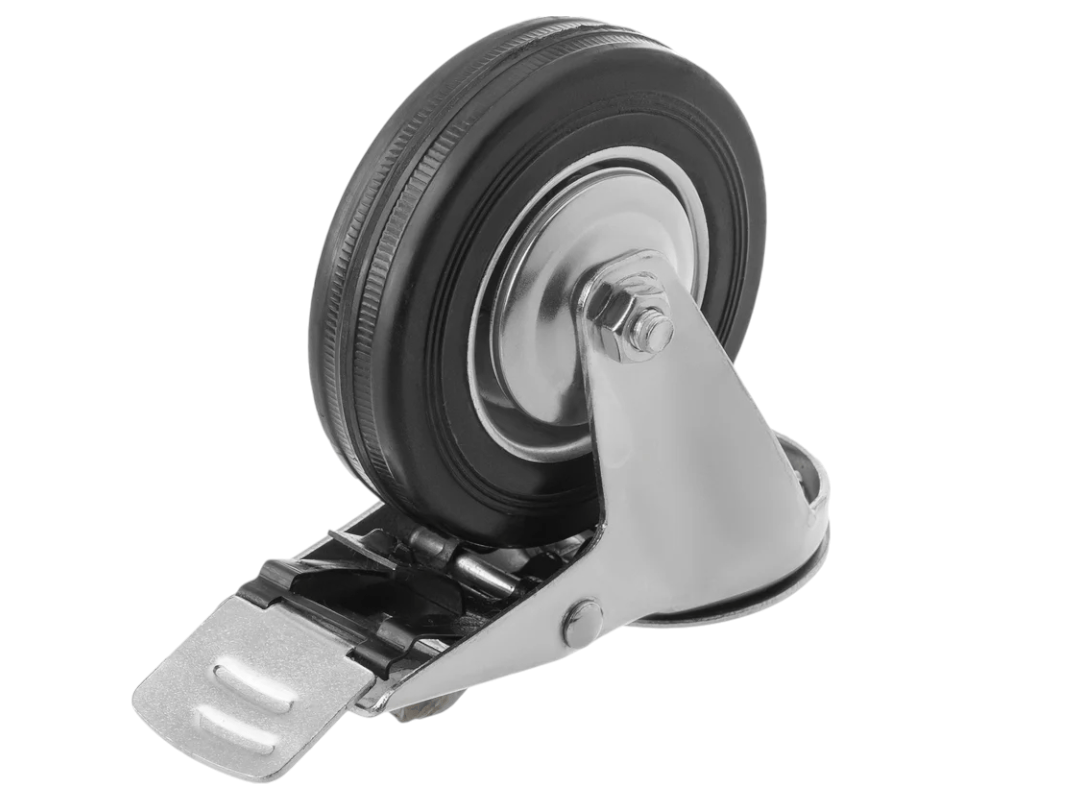 Конструкция колёс включает роликовый подшипник, стальной обод и шинку из чёрной резины, которая обеспечивает плавность и мягкость хода. Однако, по сравнению с полиуретановыми колёсами, эти колёса менее износостойки. Поворотный узел с двухрядным шарикоподшипником надёжно защищён пластиковым пыльником, что обеспечивает длительный срок службы.