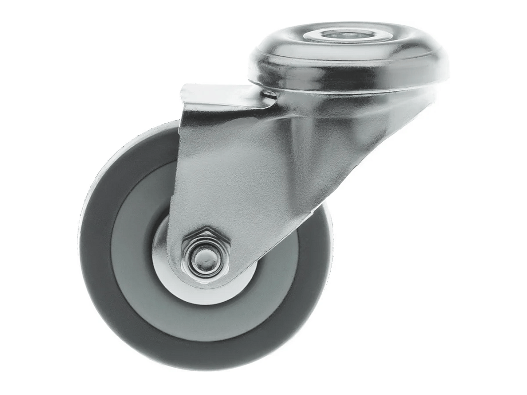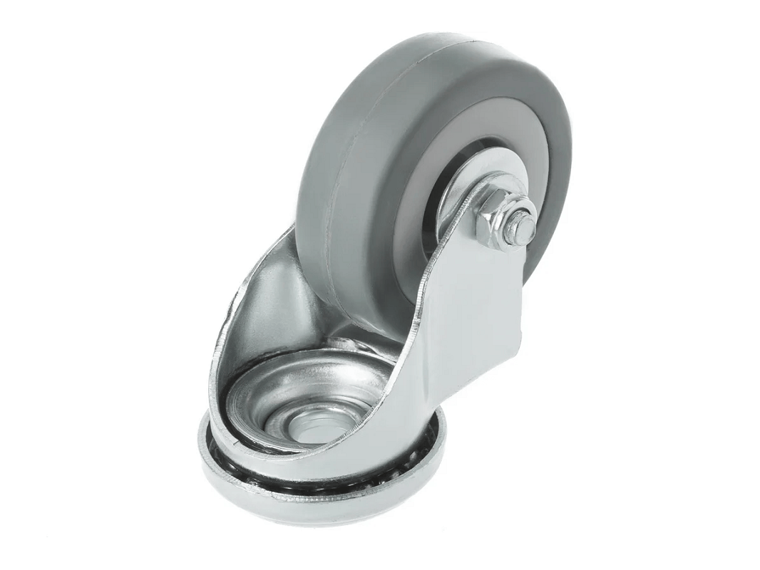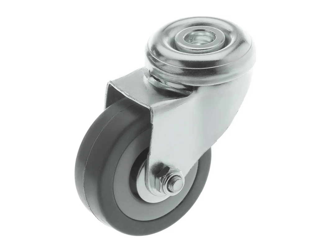 Аппаратное поворотное колесо под болт с полипропиленовым ободом и диаметром от 50 до 120 мм — это высококачественный продукт, выполненный из серой резины и оснащённый подшипником скольжения. Колёса не оставляют следов на поверхности и отличаются практически бесшумным ходом по ровным поверхностям.