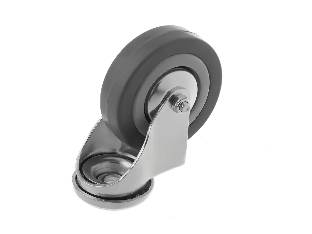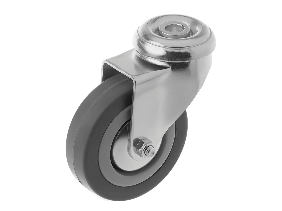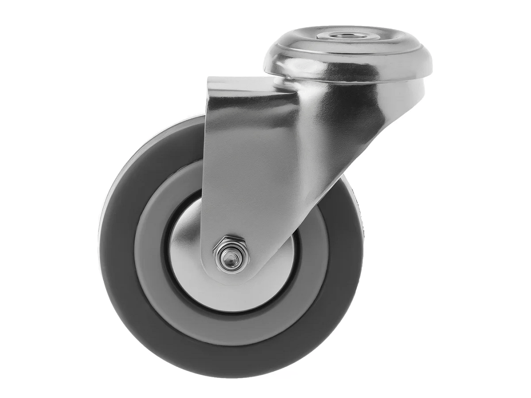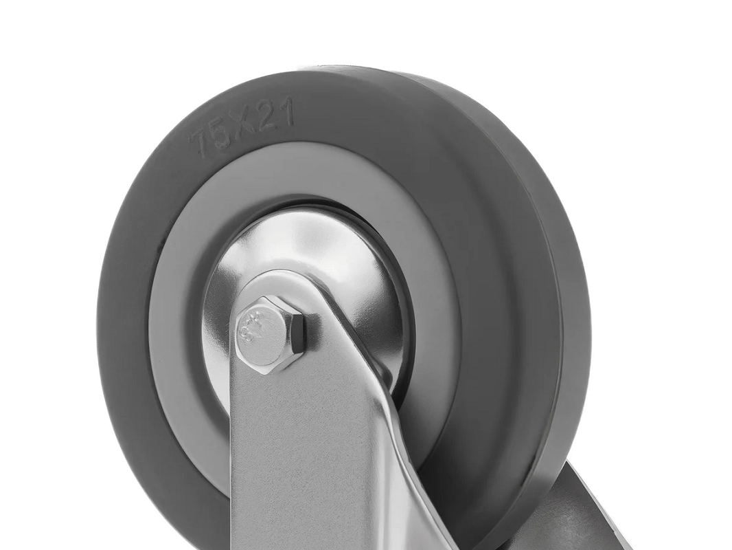 Колесо аппаратное под болт М10 SChg 93 (75 мм/70 кг), выполненный из серой резины и оснащённый подшипником скольжения. Колёса не оставляют следов на поверхности и отличаются практически бесшумным ходом по ровным поверхностям.