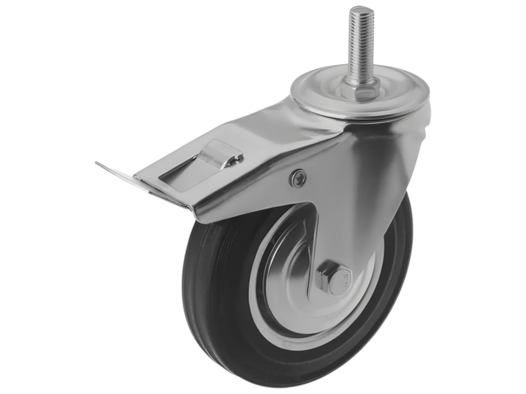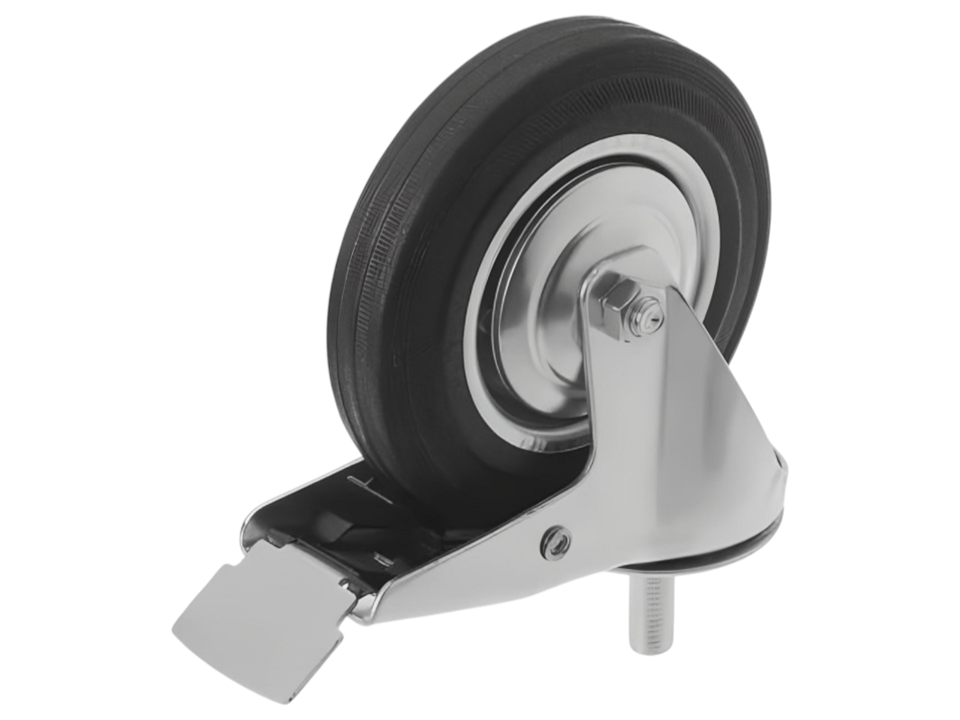 Поворотный узел колеса с двухрядным шарикоподшипником надёжно защищён пластиковым пыльником. Тормоз фиксируется нажатием на «педальку», которая расположена в легкодоступном месте перед оператором. Эта модель отличается поворотной осью и болтовым креплением с тормозом.