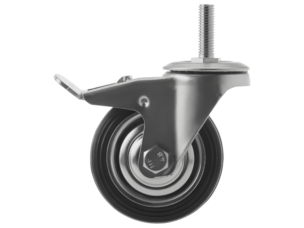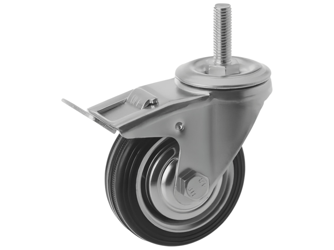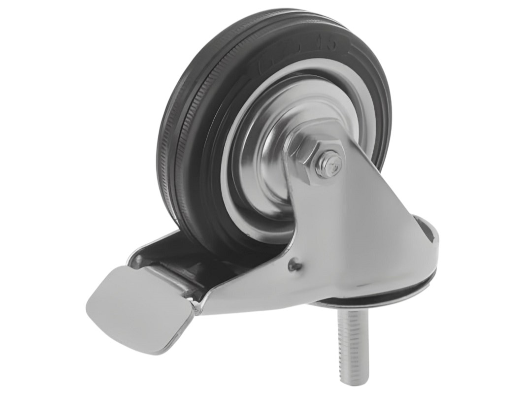 Поворотный узел колеса с двухрядным шарикоподшипником надёжно защищён пластиковым пыльником. Тормоз фиксируется нажатием на «педальку», которая расположена в легкодоступном месте перед оператором. Эта модель отличается поворотной осью и болтовым креплением с тормозом.
