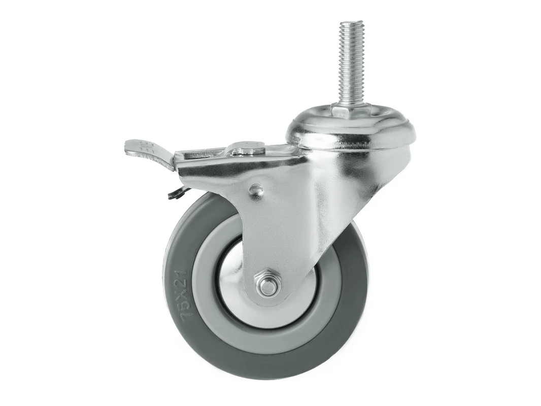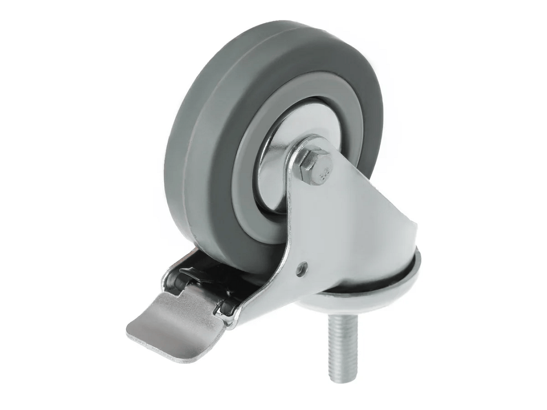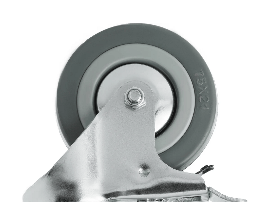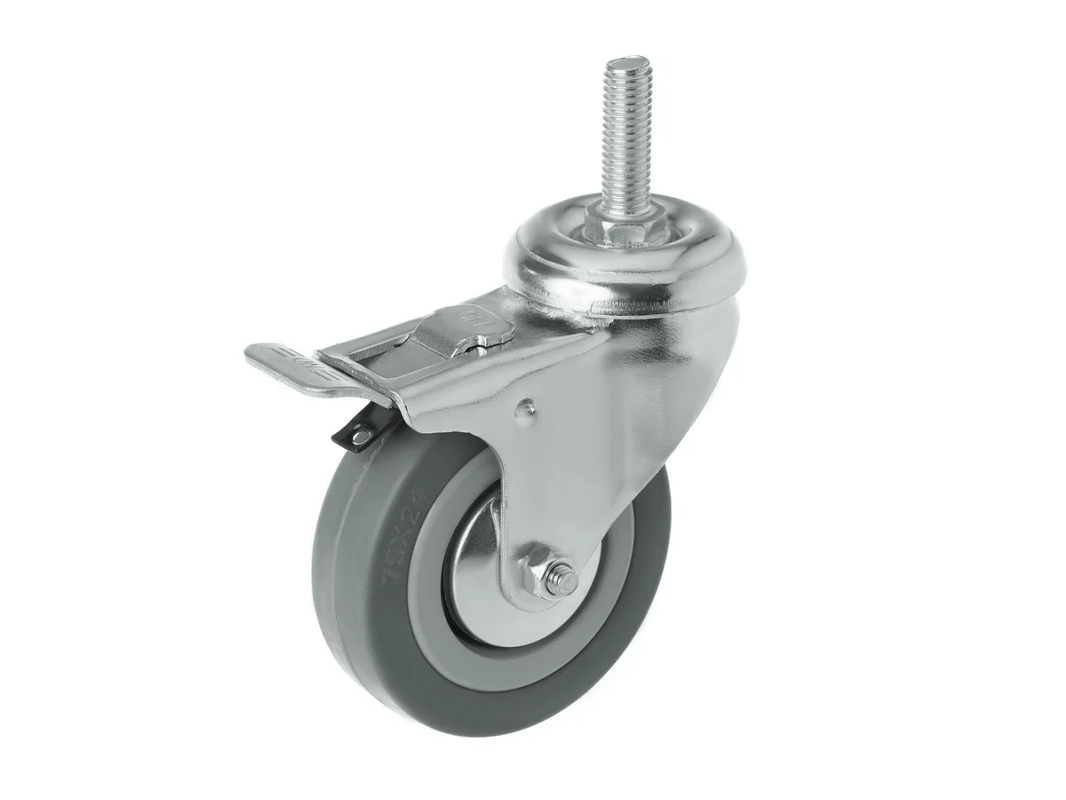 Колесо аппаратное с болтом М10 и тормозом SCtgb 93 (75 мм/70 кг). Ступица с подшипником скольжения и устойчивый к коррозии стальной кронштейн, а также поворотный узел с двухрядным шарикоподшипником — всё это обеспечивает долговечность и надежность конструкции. Кронштейн с болтовым креплением выполнен из оцинкованной стали, что добавляет прочности и долговечности.