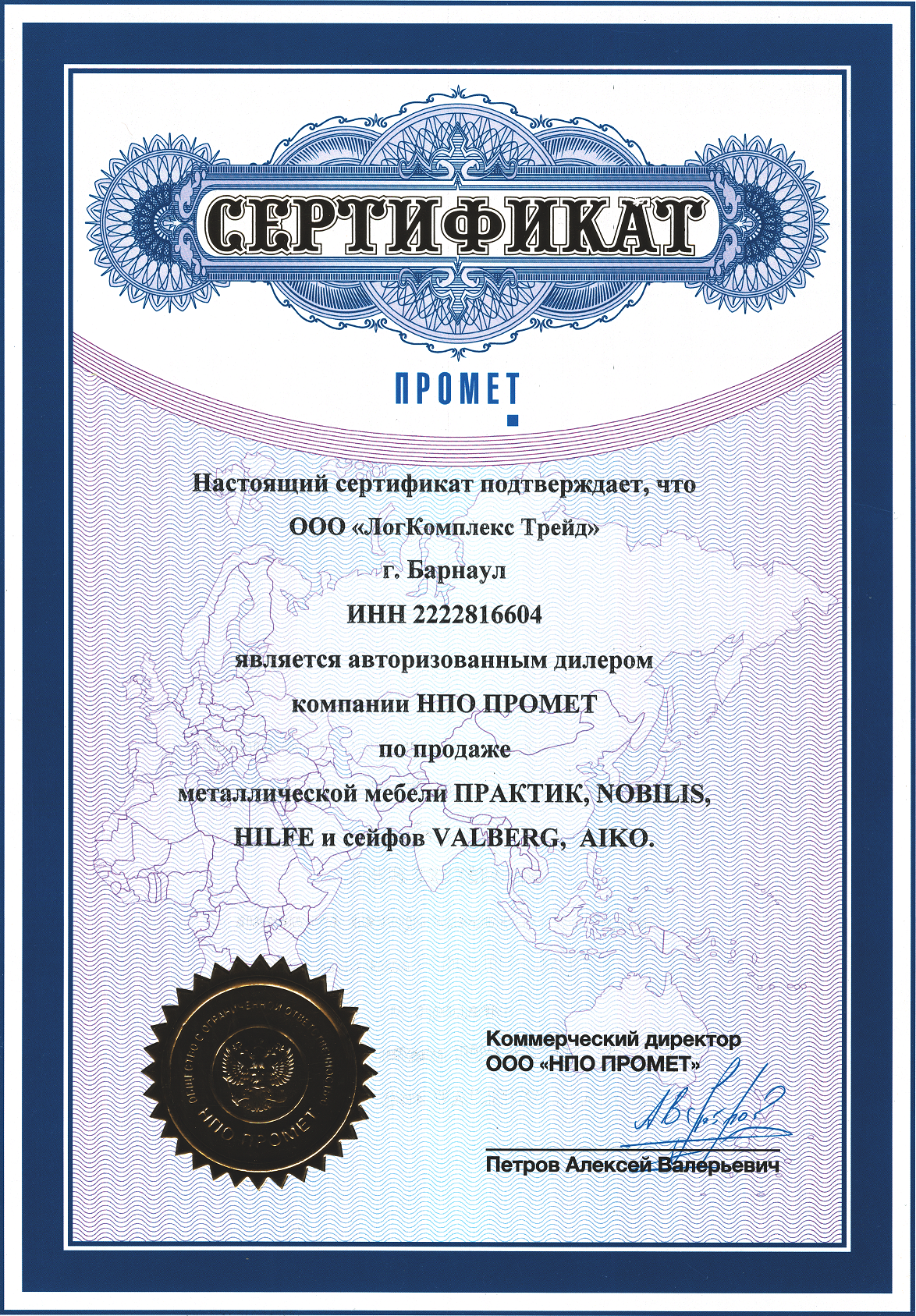 Данный сертификат подтверждает, что компания ООО «ЛогКомплекс Трейд» является авторизованным дилером компаний «НПО ПРОМЕТ» по продаже металлической мебели серии ПРАКТИК, NOBILIS, HILFE и сейфов VALBERG, AIKO.