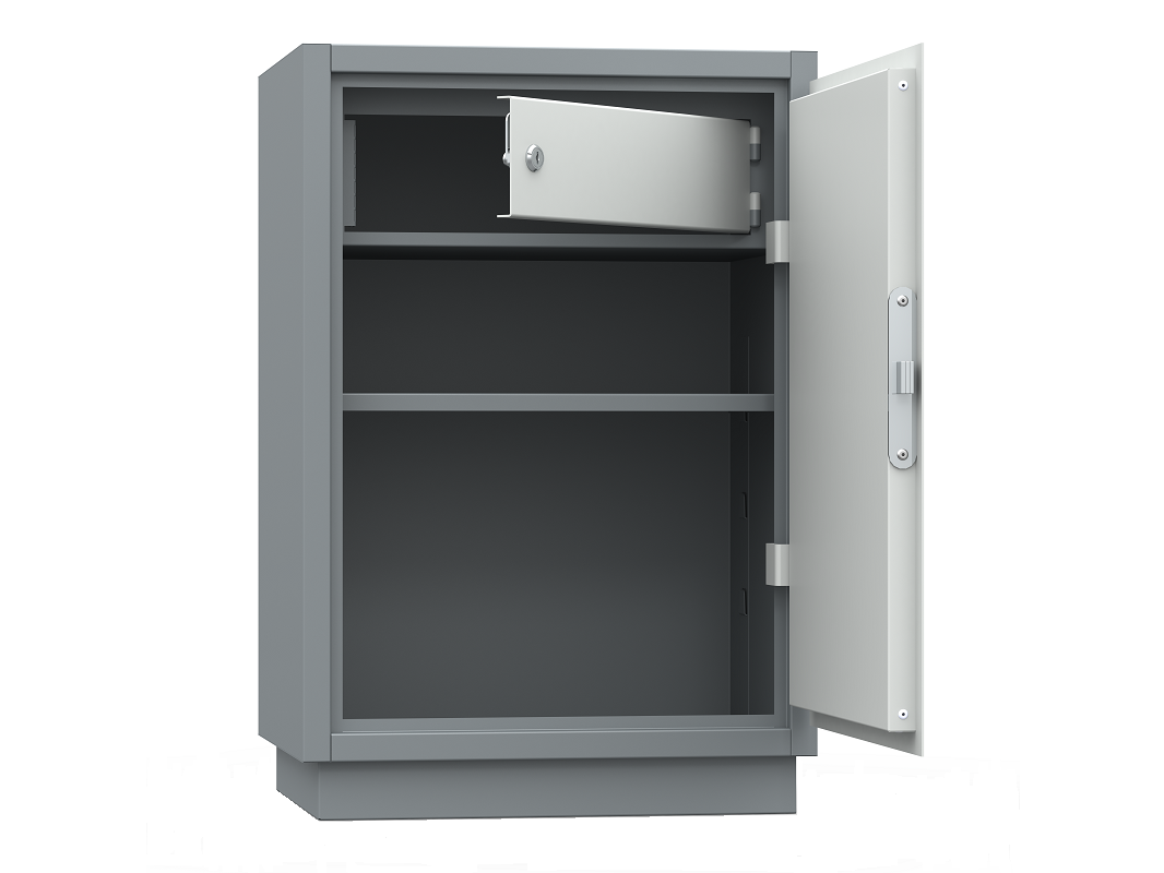Шкаф поставляется в собранном виде и изготовлен из цельносварной холоднокатной стали. Безопасность хранения обеспечивается высококачественным замком сувальдного типа, который имеет три ключа в комплекте. Усиленная лицевая дверь надежно защищает содержимое.