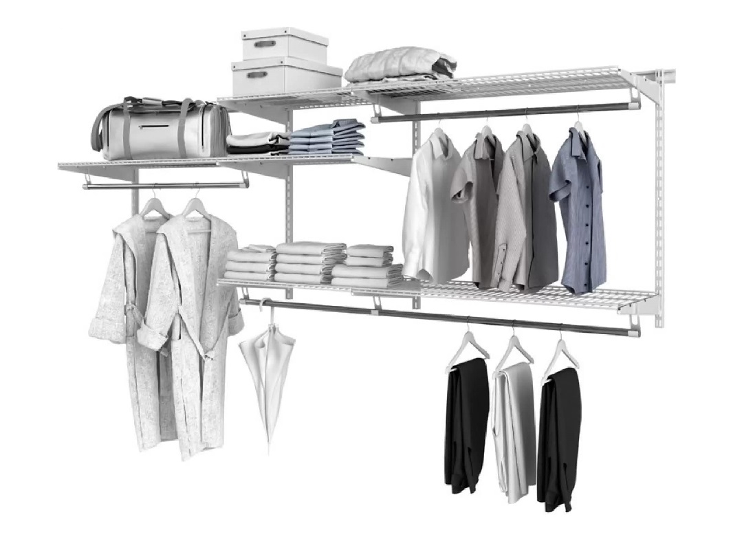 В комплекте: 2 рельса для крепления стоек (1000 мм), 4 стойки для установки кронштейнов (1152 мм), 9 кронштейнов для размещения сеточных полок (335 мм), 7 кронштейнов для перекладин, 3 сеточные полки (306х603 мм), 3 сеточные полки (306х903 мм), 1 перекладина для вешалок (640 мм), 3 перекладины для вешалок (940 мм), 1 соединитель для перекладины, 3 комплекта торцевых заглушек для перекладин.