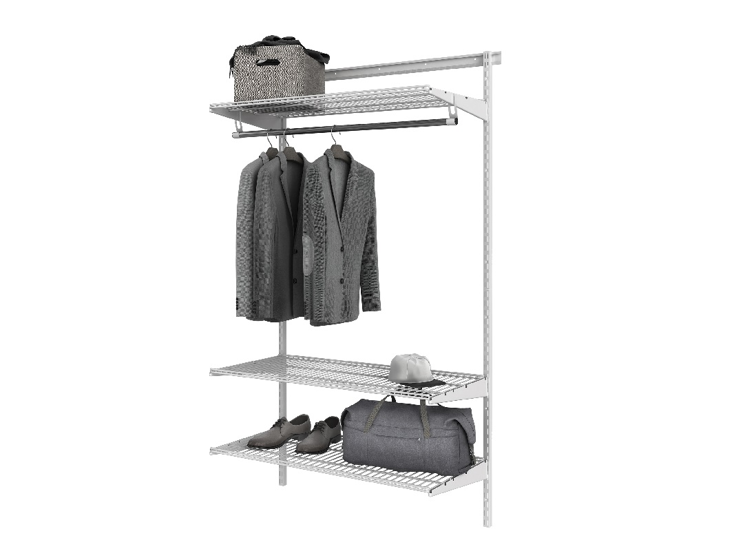 В комплекте: 1 рельса для крепления стоек (1000 мм), 4 стойки для установки кронштейнов (1025 мм), 6 кронштейнов для размещения сеточных полок (335 мм/435 мм), 2 кронштейна для перекладины, 3 сеточные полки (306х903 мм/406х903 мм), 1 перекладина для вешалок (940 мм), 1 комплект торцевых заглушек для перекладины.