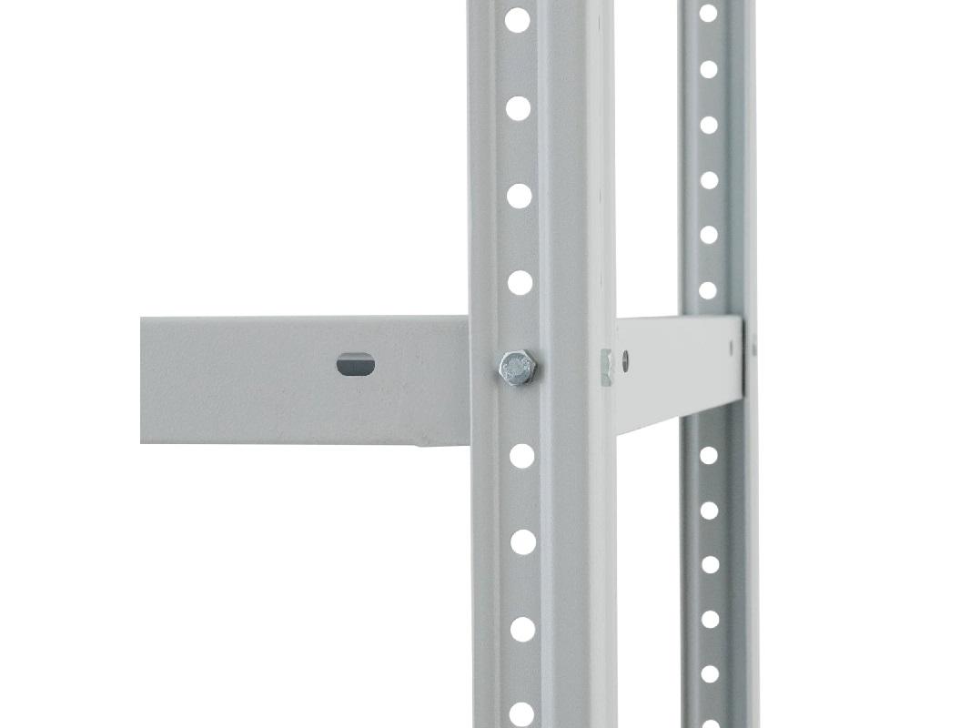 В данной комплектации установлена полка с максимальной нагрузкой до 100 килограмм, нагрузка должна быть распределена по всей полки во избежание провисания. В собранном виде стеллаж способен выдерживать до 500 килограмм, при необходимости устанавливаются ограничители по длине и ширине, продольные и поперечные разделители. К дополнительным опциям относится установка задней и боковой стенки. Пластиковый подпятник можно поменять на металлический или на регулируемую опору, которая позволит изменить высоту всего стеллажа.