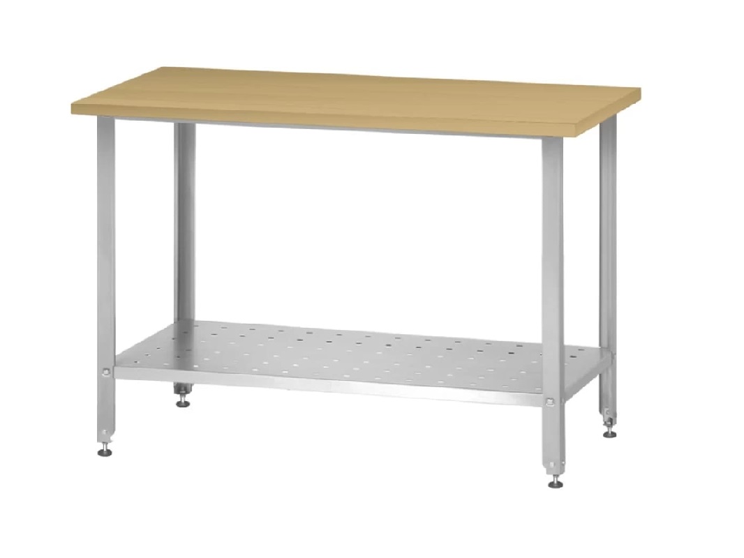 Стол серии NORMA используется для организации рабочего места. Столешница изготовлена из бука толщиной 40 мм. В стандартную комплектацию входит полка перфорированная из нержавеющей стали толщиной 0,8 мм — 1 штука. Опционально устанавливается полка-надстройка, комплект колес. Поставляется в разборном виде, соединяется при помощи болтового крепления.