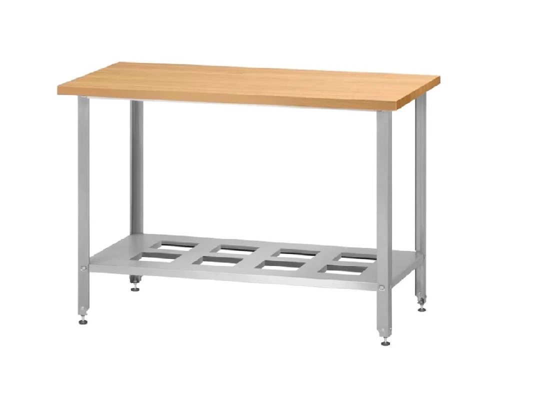 Стол серии NORMA используется для организации рабочего места. Столешница изготовлена из бука толщиной 40 мм. В стандартную комплектацию входит полка решетка из нержавеющей стали толщиной 0,8 мм — 1 штука. Опционально устанавливается полка-надстройка, комплект колес. Поставляется в разборном виде, соединяется при помощи болтового крепления.