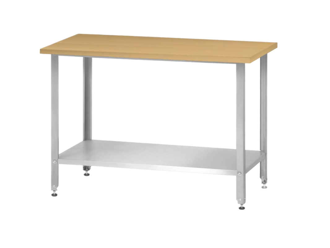 Стол серии NORMA используется для организации рабочего места. Столешница изготовлена из бука толщиной 40 мм. В стандартную комплектацию входит полка сплошная из нержавеющей стали толщиной 0,8 мм — 1 штука.