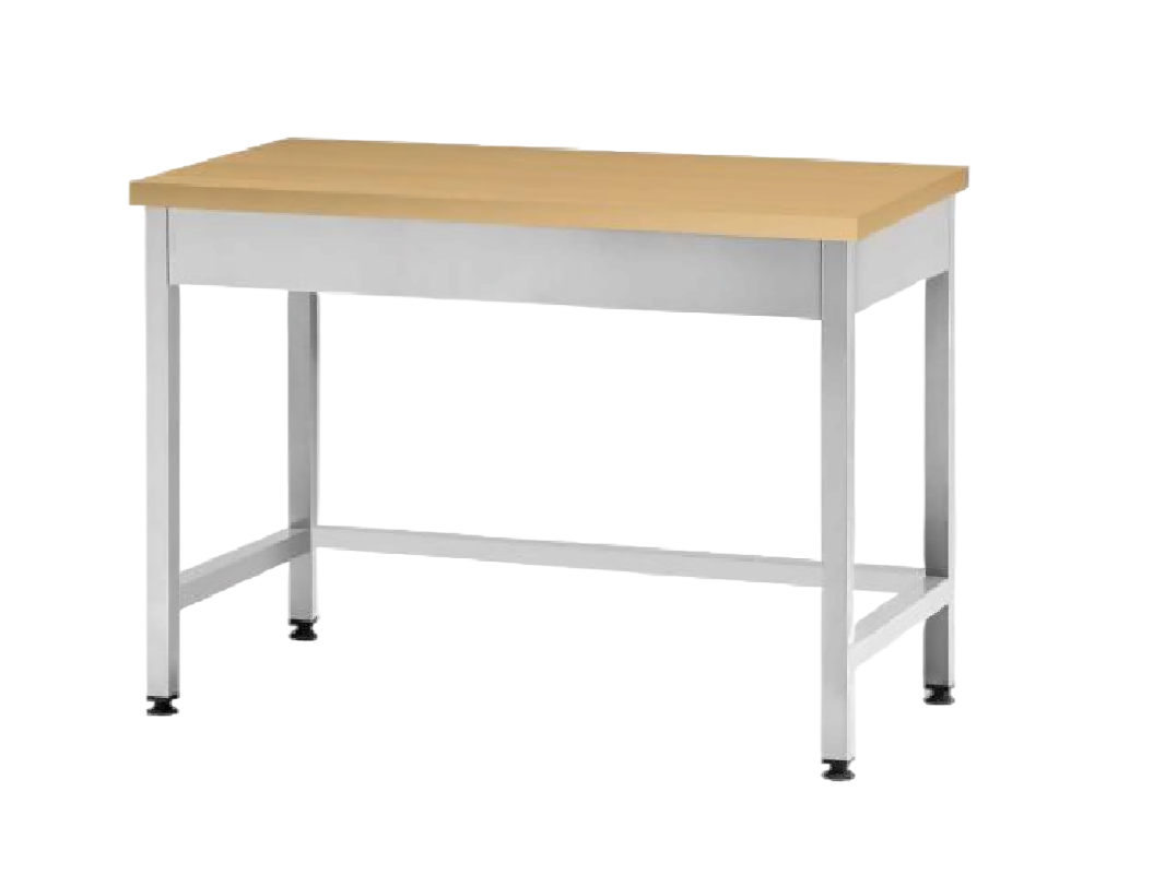 Стол серии PROFI используется для организации рабочего места. Столешница изготовлена из бука толщиной 40 мм. В стандартную комплектацию входит полка-обвязка из нержавеющей стали толщиной 1,5 мм — 1 штука.