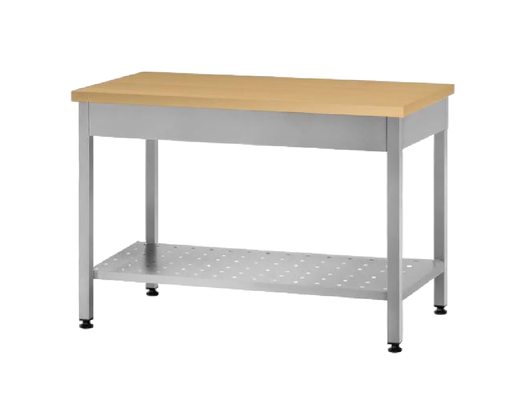 Стол серии PROFI используется для организации рабочего места. Столешница изготовлена из бука толщиной 40 мм. В стандартную комплектацию входит полка перфорированная из нержавеющей стали толщиной 0,8 мм — 1 штука.