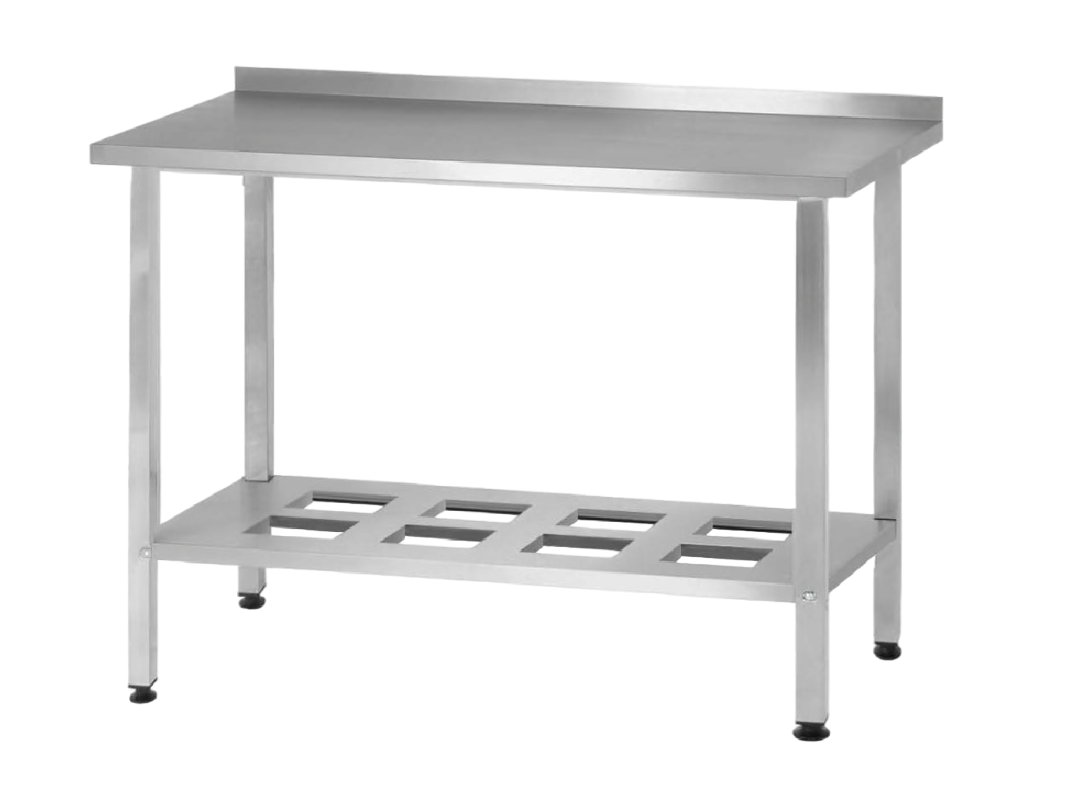 Стол серии NORMA используется для организации рабочего места. Столешница изготовлена из ЛДСП толщиной 16 мм с покрытием из нержавеющей стали AISI 430 и толщиной 0,8 мм. В стандартную комплектацию входит полка решетка толщиной 0,8 мм — 1 штука.