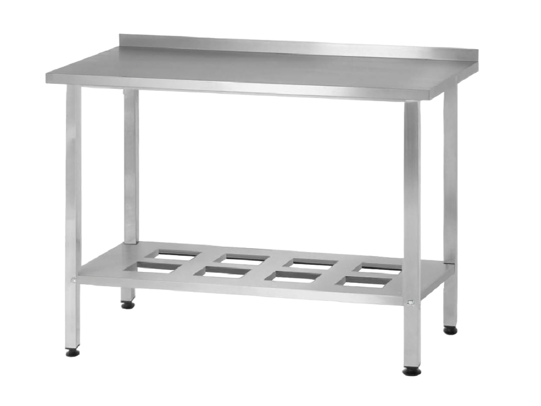 Стол серии NORMA используется для организации рабочего места. Столешница изготовлена из ЛДСП толщиной 16 мм с покрытием из нержавеющей стали AISI 430 и толщиной 0,8 мм. В стандартную комплектацию входит полка решетка толщиной 0,8 мм — 1 штука.