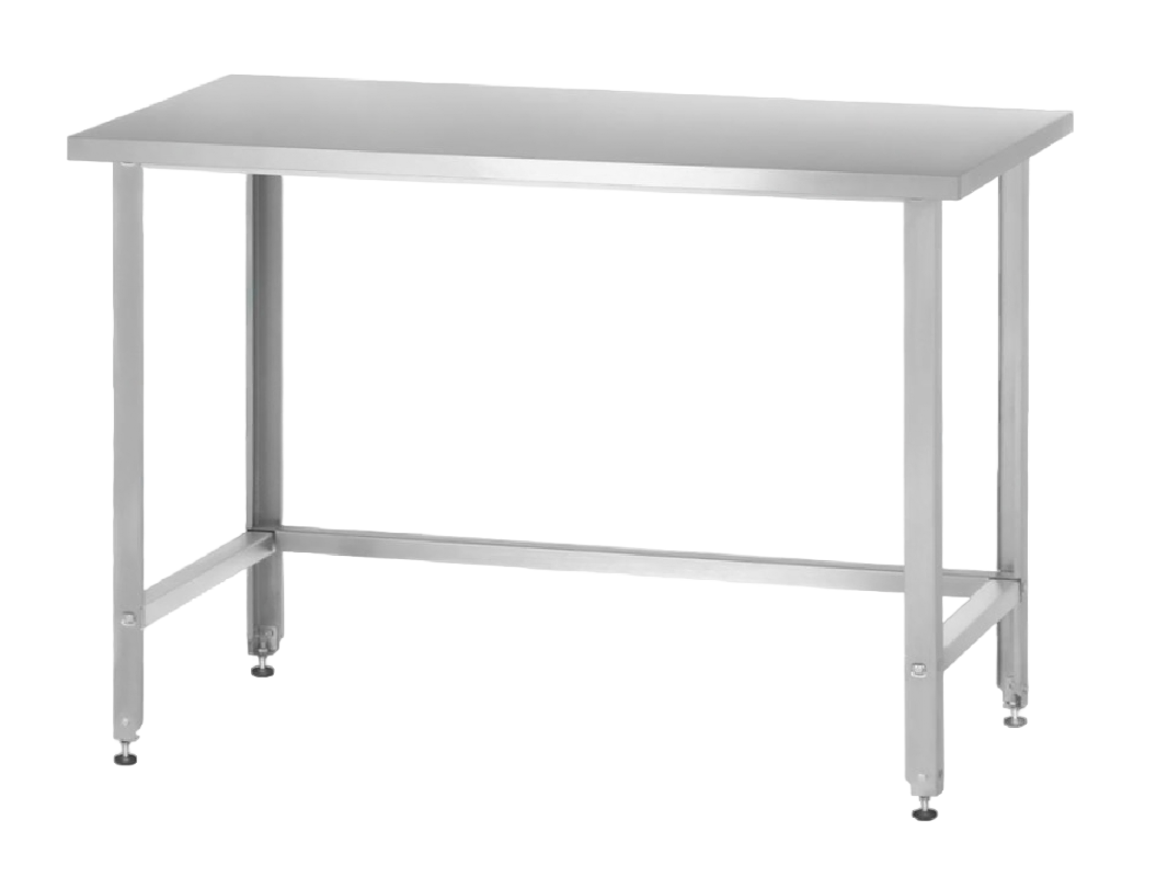 Стол серии NORMA используется для организации рабочего места. Столешница изготовлена из ЛДСП толщиной 16 мм с покрытием из нержавеющей стали AISI 430 и толщиной 0,8 мм. В стандартную комплектацию входит полка обвязка толщиной 1,5 мм — 1 штука. Сварная ножка.