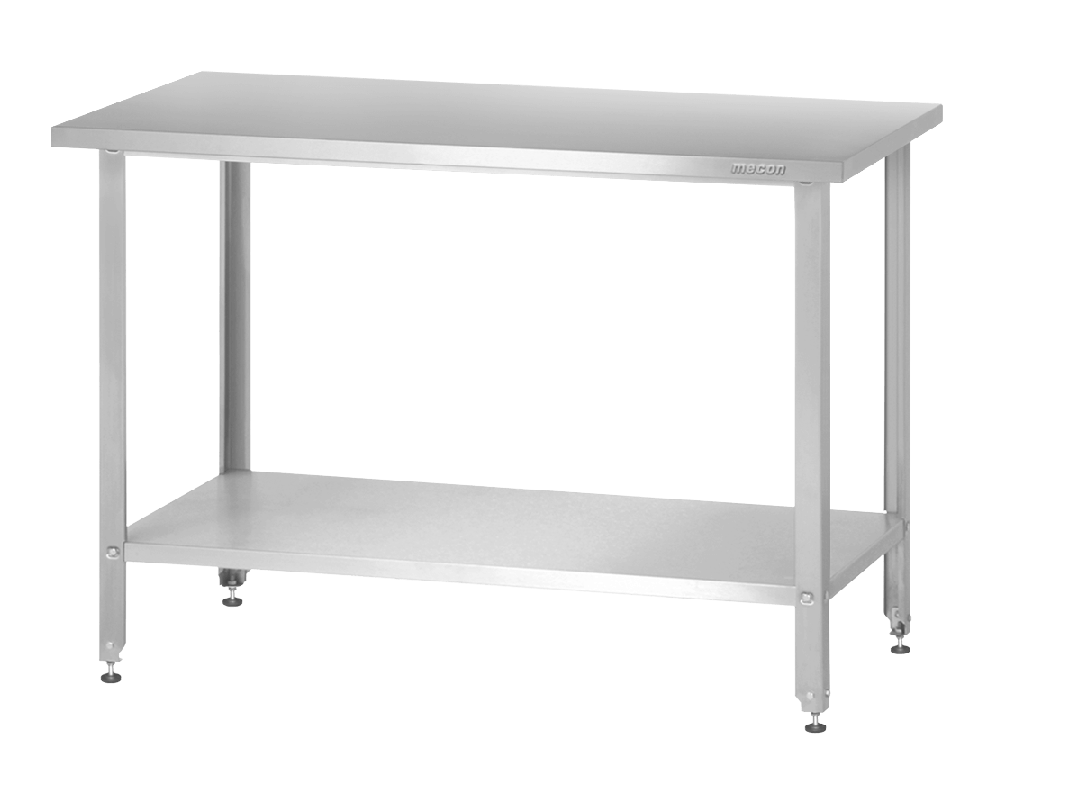 Стол серии NORMA используется для организации рабочего места. Столешница изготовлена из ЛДСП толщиной 16 мм с покрытием из нержавеющей стали AISI 430 и толщиной 0,8 мм. В стандартную комплектацию входит полка сплошная толщиной 0,8 мм — 1 штука.