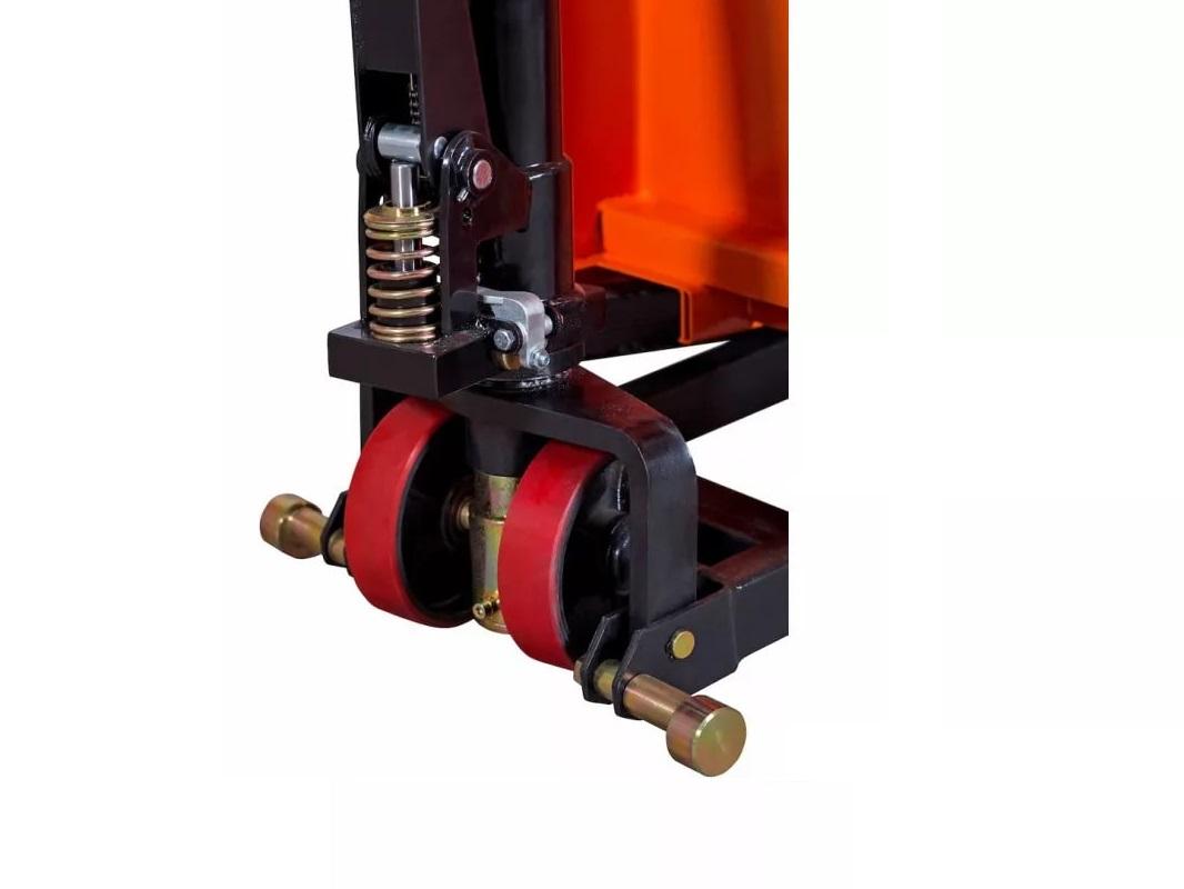 При подъёме на высоту от 20 см и выше срабатывает механизм «ножницы», который предотвращает движение тележки, обеспечивая безопасность. На более низких высотах, до 20 см, эта техника функционирует как обычная гидравлическая тележка.