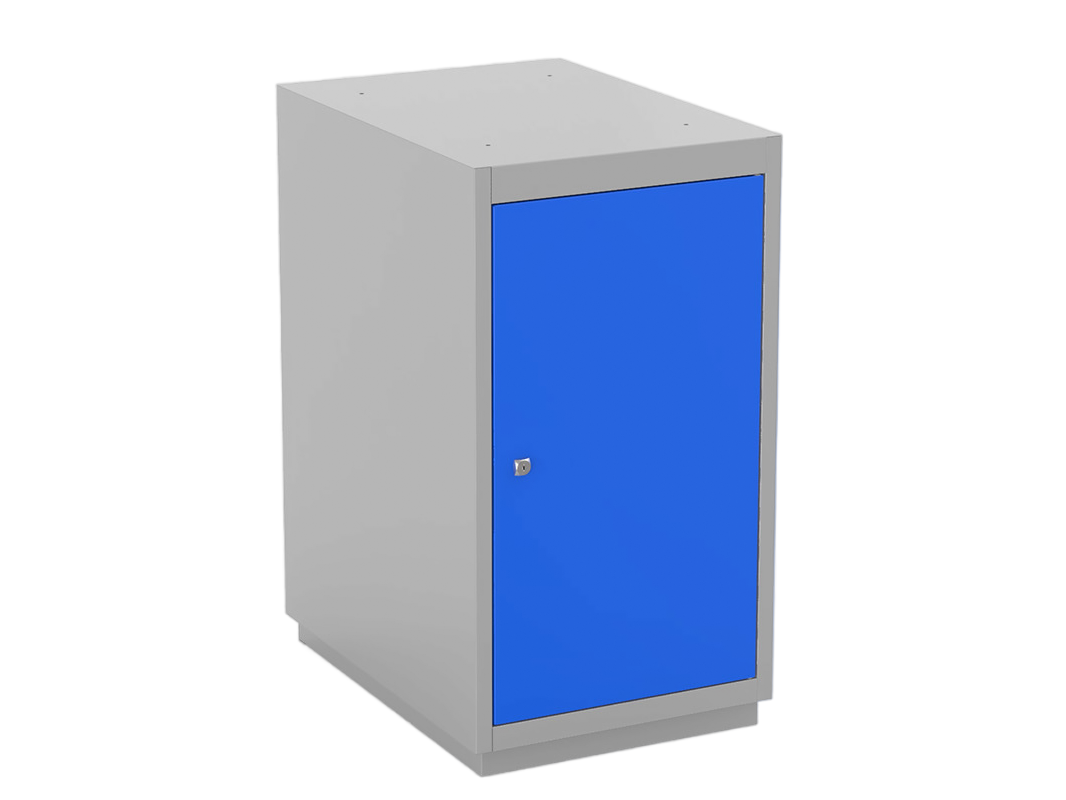 Тумба ВС — это неотъемлемая часть любого верстака. Т1 укомплектована двумя полками, внутри расположены специальные крепления, которые позволяют регулировать полку по высоте и в случае необходимости быстро снять. Имеет уже привычный и стандартный цвет, дверь окрашена в синий цвет (RAL 5015), корпус в светло-серый (RAL 7035). Закрывается на один центральный замок, в комплекте поставляется 2 ключа.