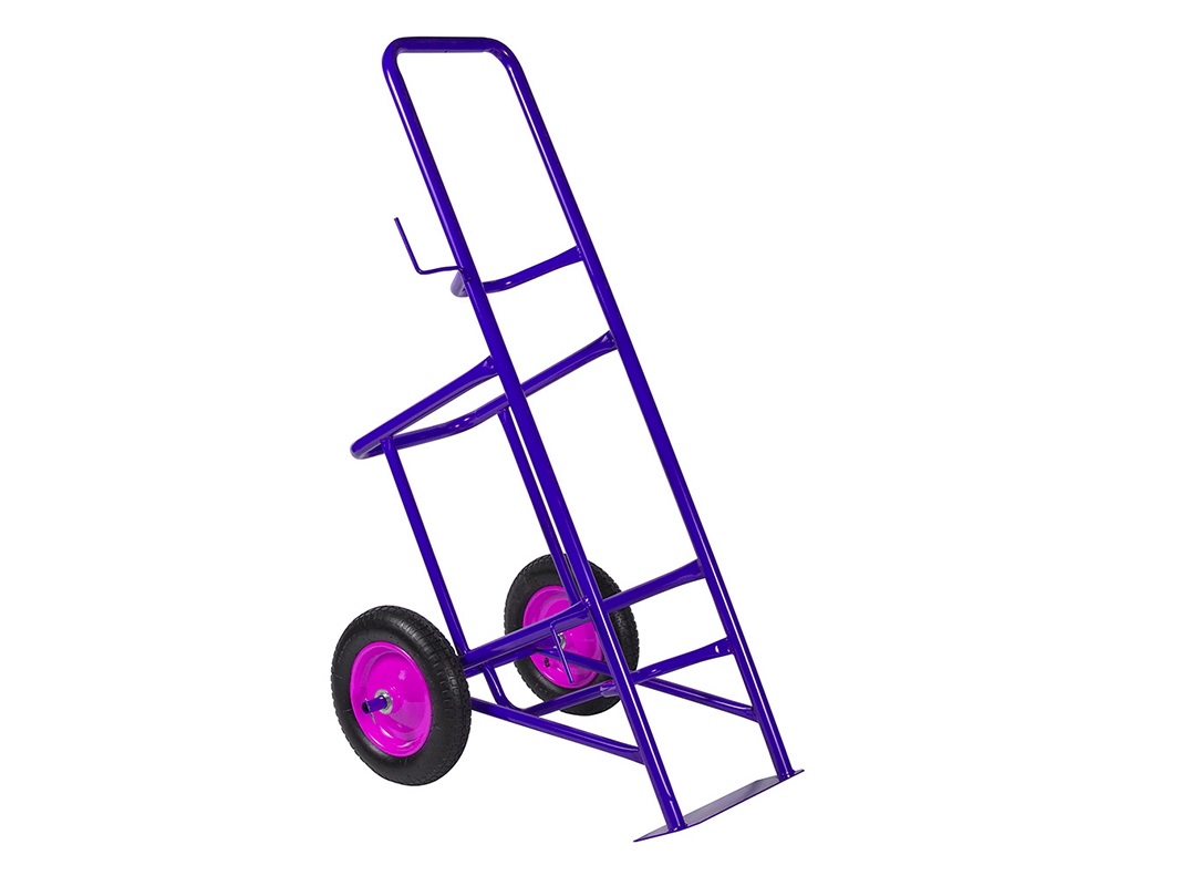 Изготовленная из прочных стальных труб тележка обладает высокой надежностью и стойкостью к внешним нагрузкам. Баллоны размещаются в отдельных специализированных ячейках: резервуар с пропаном устанавливается ближе к основанию тележки, тогда как емкость с кислородом или другим газом закрепляется отдельно и дополнительно защищена металлической рамой. Надежность фиксации обеспечивают оцинкованные цепи, исключающие случайное смещение баллонов при транспортировке.