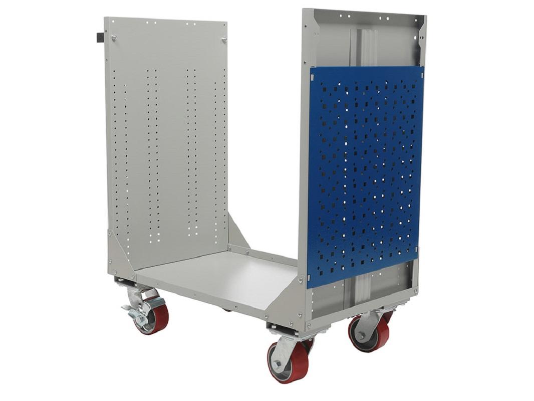 Тележка комплектуется большегрузными поворотными колесами с износостойкой шиной из полиуретана, обод выполнен из чугуна и оснащен смазочным нипелем, в конструкции применен сварной оцинкованный кронштейн, толщина которого составляет 6 мм. Резиновые колеса с диаметром 100 мм, из которых 2 неповоротных, 1 поворотное и 1 поворотное с тормозом. К инструментальной тележки есть возможность установить перфорированный экран и другие дополнительные аксессуары.