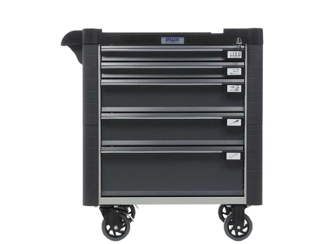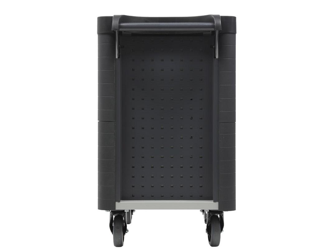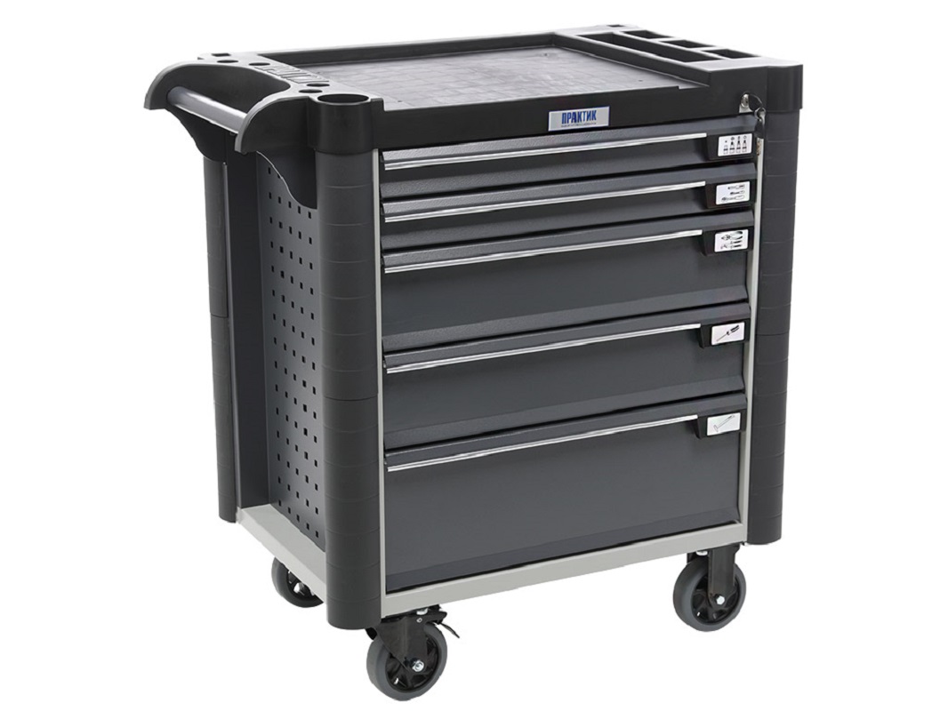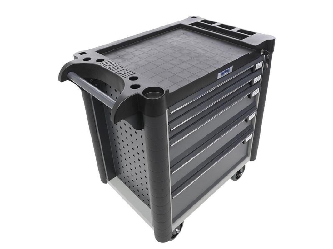 Инструментальная тележка WDS M-5.0 используется для организации складского хранения, новая линейка тележек, отличающаяся дизайном и функциональностью. Сварная конструкция с толщиной металла корпуса 0,8 мм. Для удобного перемещения тележка оснащена ручкой и колесами, из которых два поворотных с тормозом и два неповоротных. Колеса изготовлены из специальной немаркой резины диаметром 125 мм. WDS M-5.0 с перфорированными боковыми стенками, они используются для размещения навесного оборудования. Перфорация стандартная, подходят аксессуары от верстаков серии Profi и Expert. Центральный ключевой замок, который запирает сразу все 5 ящиков. Выдвижные ящики оснащены телескопическими направляющими, обеспечивающие более плавный ход, с механическими подпружиненными затворами. Тележка подходит для использования в разных условиях, для обеспечения повышенной защиты оснащена боковыми бамперами, изготовленные из прорезиненного пластика. Крышка выполнена из черного пластика с удобными ложементами под инструмент, максимальная нагрузка до 40 килограмм.