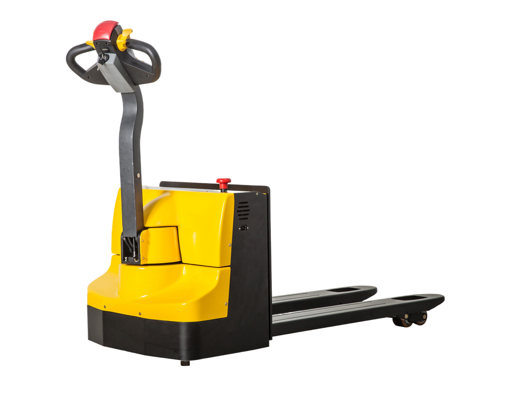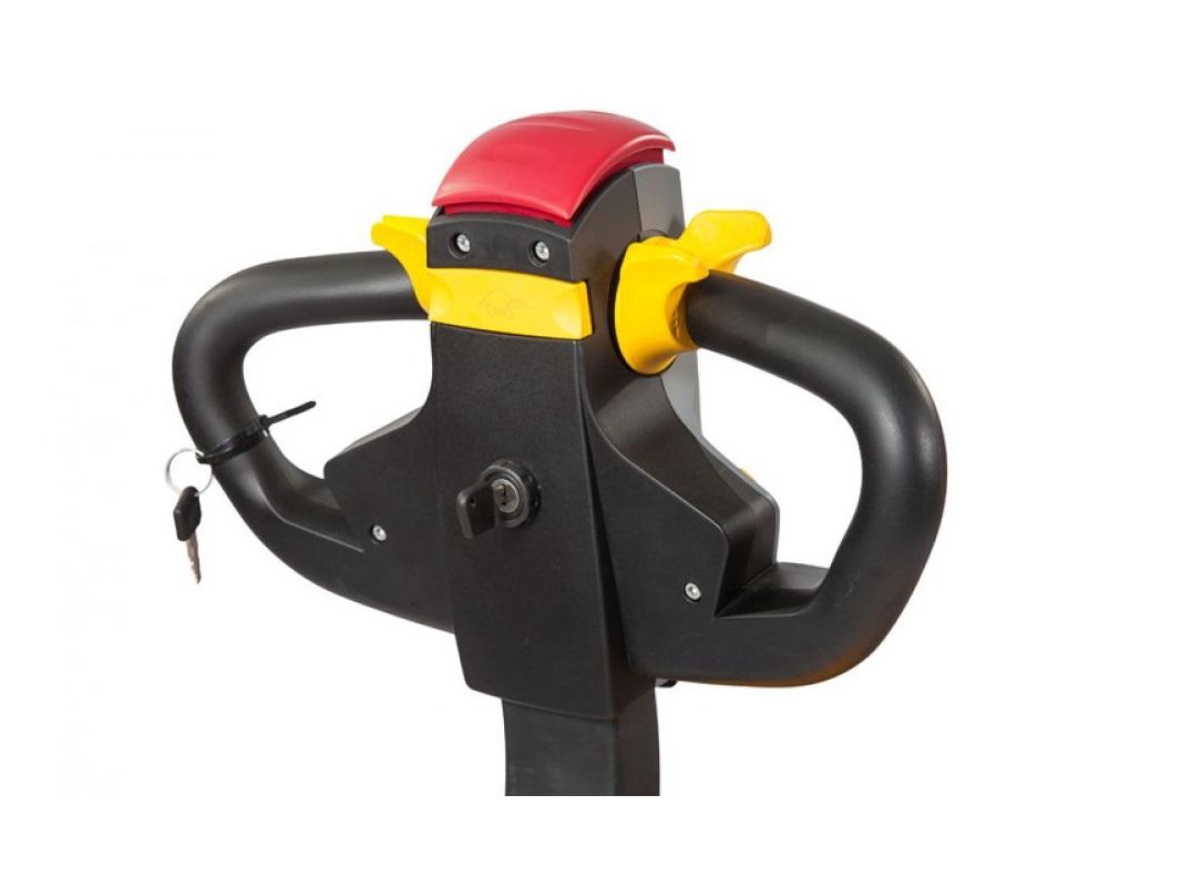 Самоходная тележка эконом-класса, с ограниченным функционалом и недорогой ценой. В конструкции электрической тележки предусмотрена система быстрой остановки, красная большая кнопка на ручке. Если получилось так, что вы немного не рассчитали расстояние и техника начала вас прижимать к стене, ручка упирается вам в пузо, происходит срабатывание кнопки и тележка самостоятельно делает небольшое движение вперед (тем самым не давая тяжелой машине вас зажать). Такая система стоит практически на всей складской технике.