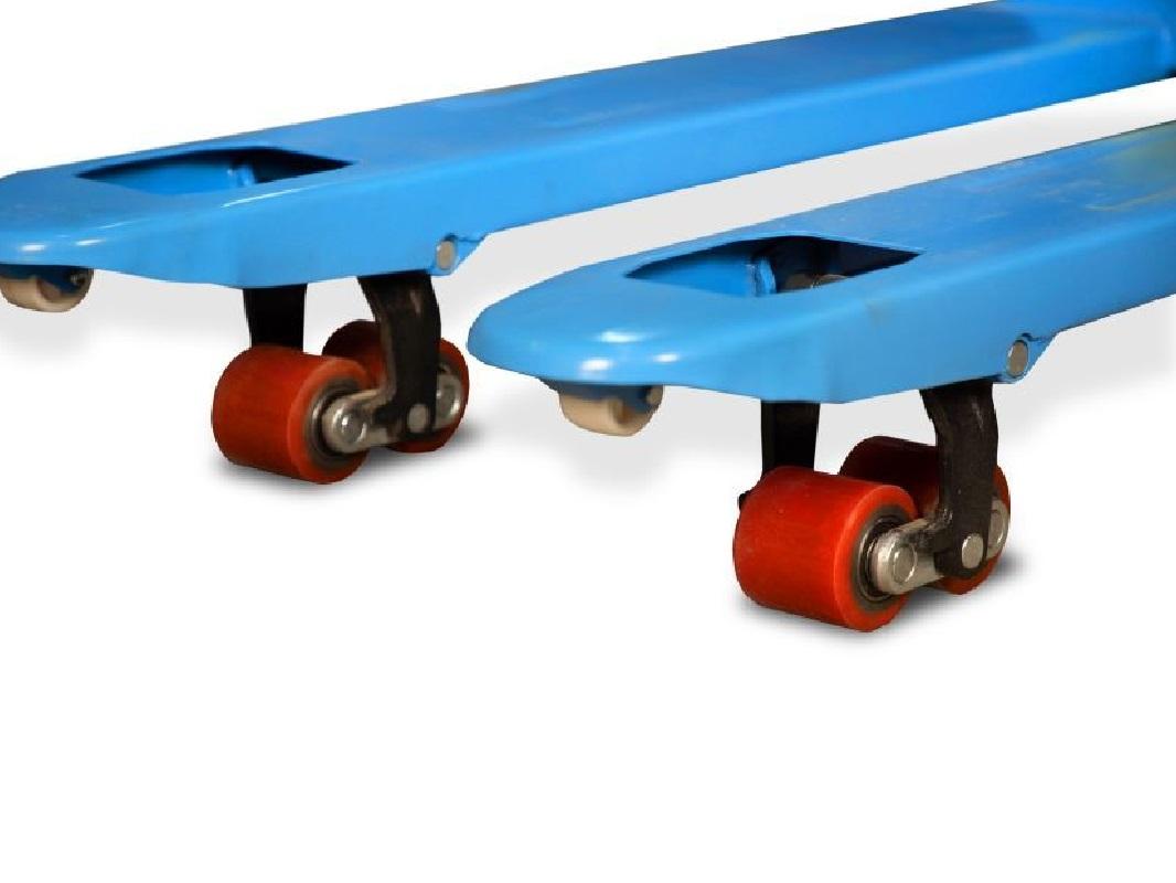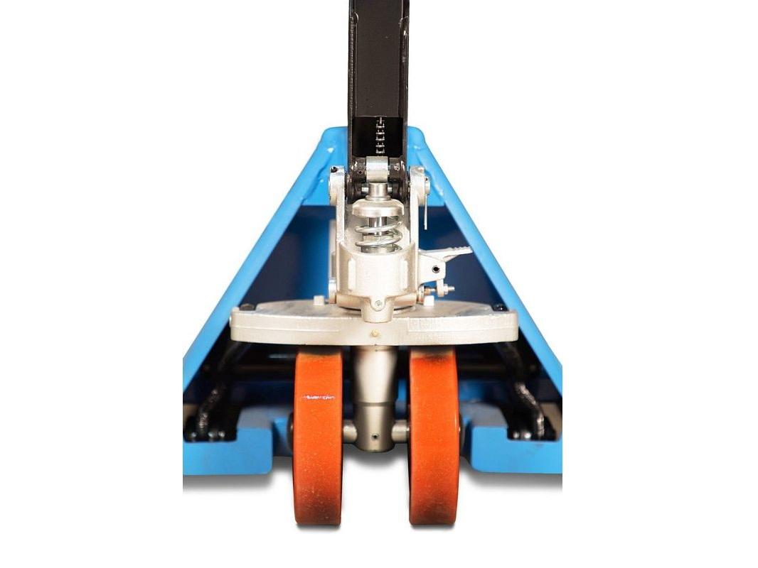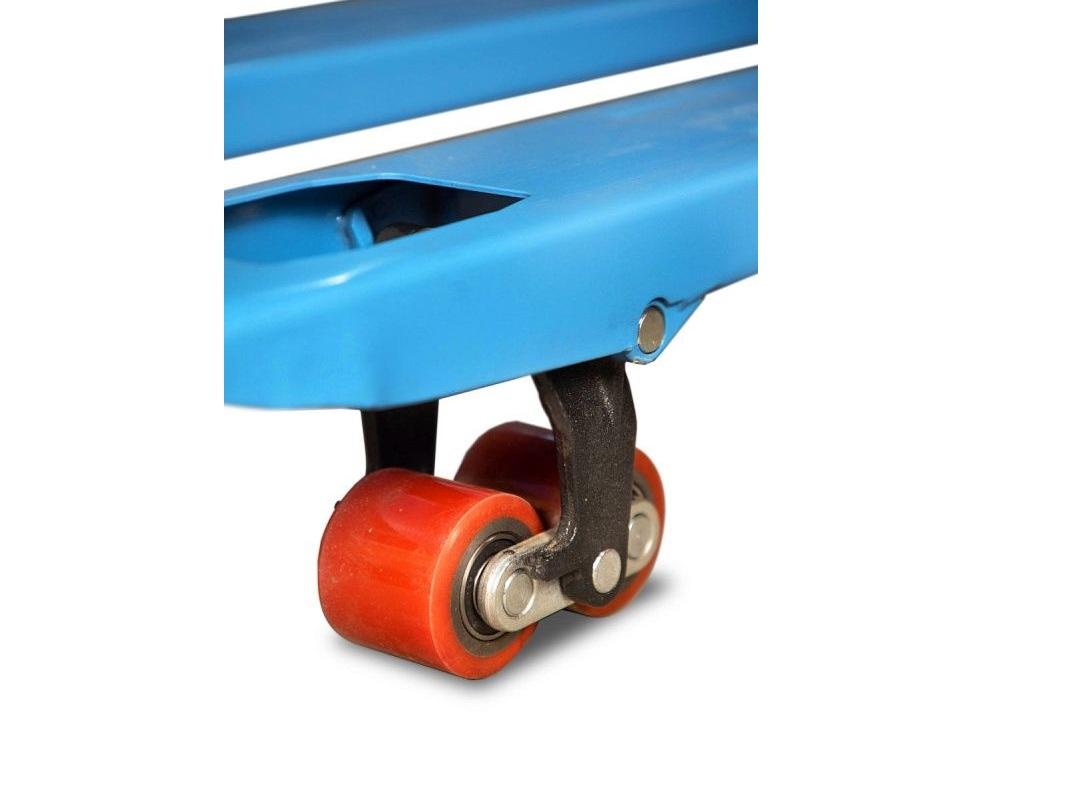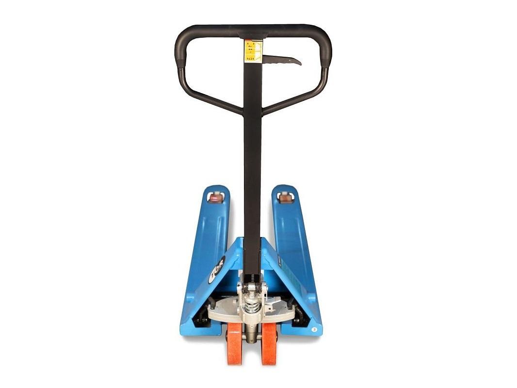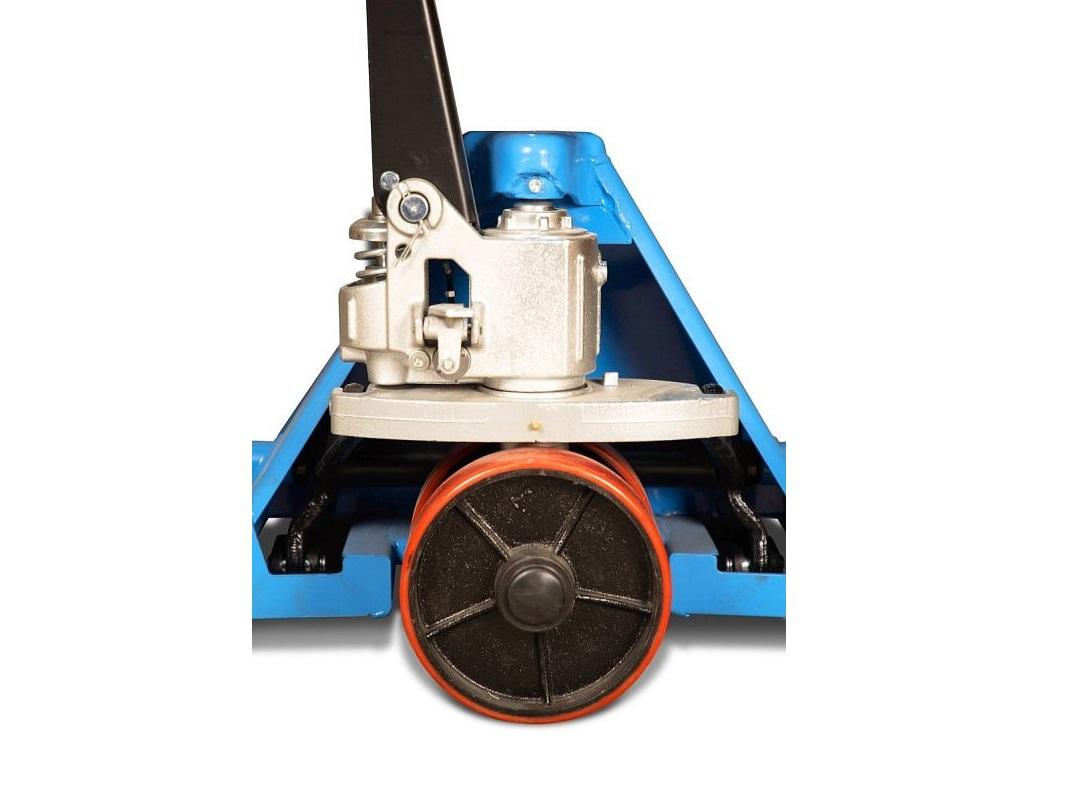 Поддоны без труда подхватываются вилами и поднимаются с помощью рычага, расположенного на рукоятке тележки. Её корпус выполнен из прочного металла, устойчивого к различным погодным условиям, что позволяет использовать её как внутри, так и вне склада.